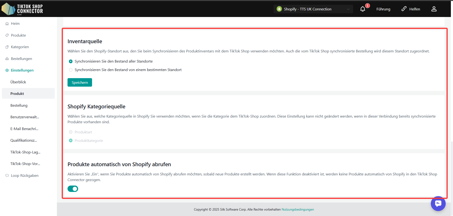 | Produkttyp/Kategorie in Shopify | "Kategorie in Shopify" für Connector by Silk |