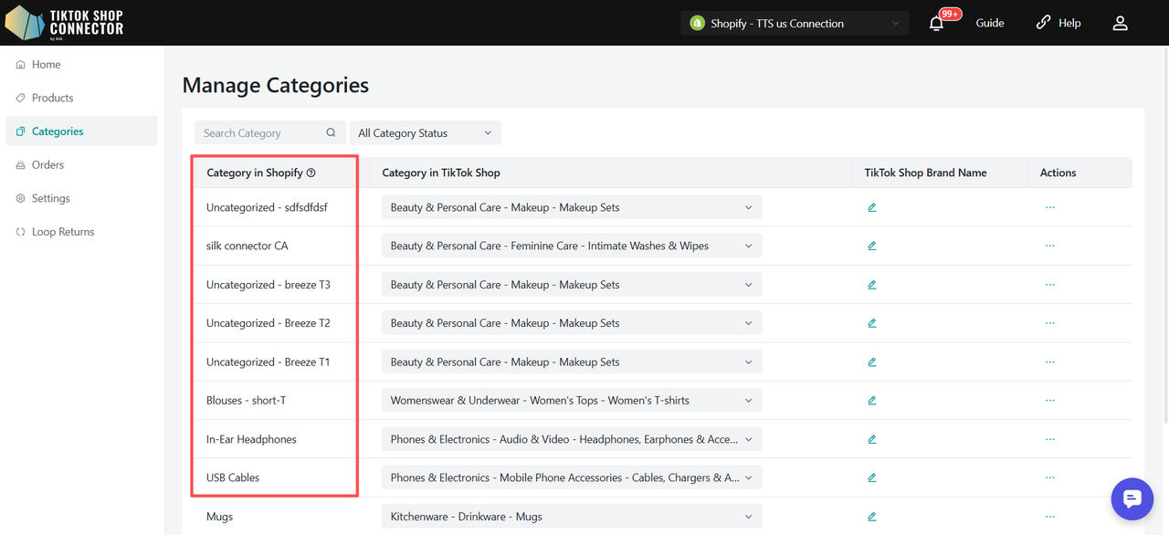 All products must have the "product type/category" filled out in Shopify. The Connector uses this field as the "Category in Shopify" to map it to the "Category in TikTok Shop"
