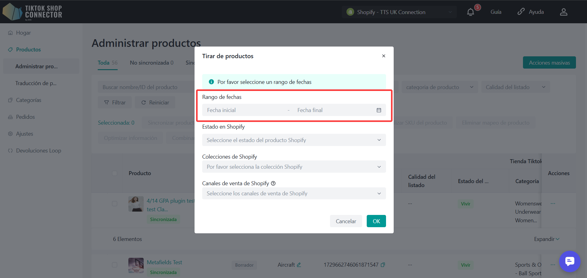 Elige el rango de fechas desde el que quieres obtener productos de Shopify.