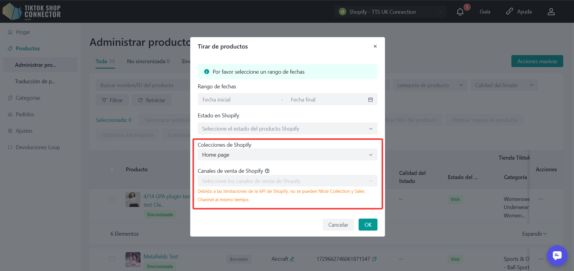 Importante: Debido a las limitaciones de la API de Shopify, las colecciones y los canales de venta no se pueden usar juntos en la misma consulta. Si seleccionas una colección, el filtro de canal de venta se desactivará, y viceversa.