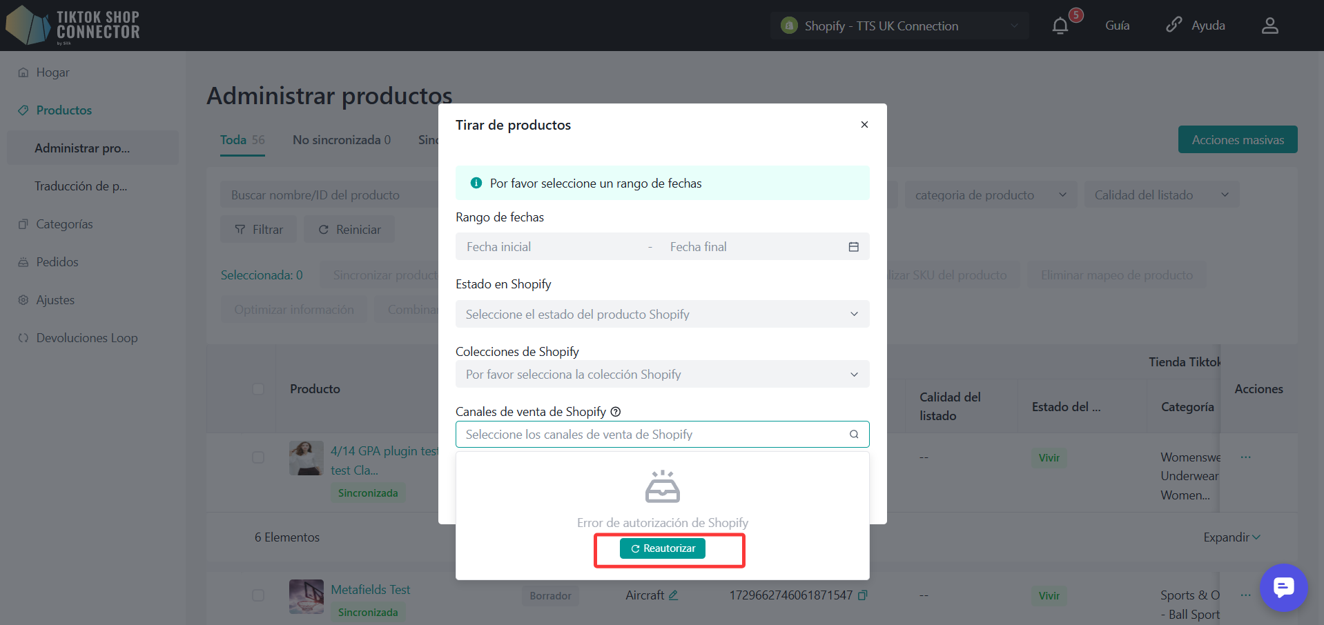 Al usar el filtro de Canales de venta de Shopify por primera vez, se te pedirá que vuelvas a autorizar la aplicación de Shopify. Este paso es necesario para que TikTok Shop Connector pueda acceder a los datos de canales de venta y disponibilidad de productos de tu tienda.