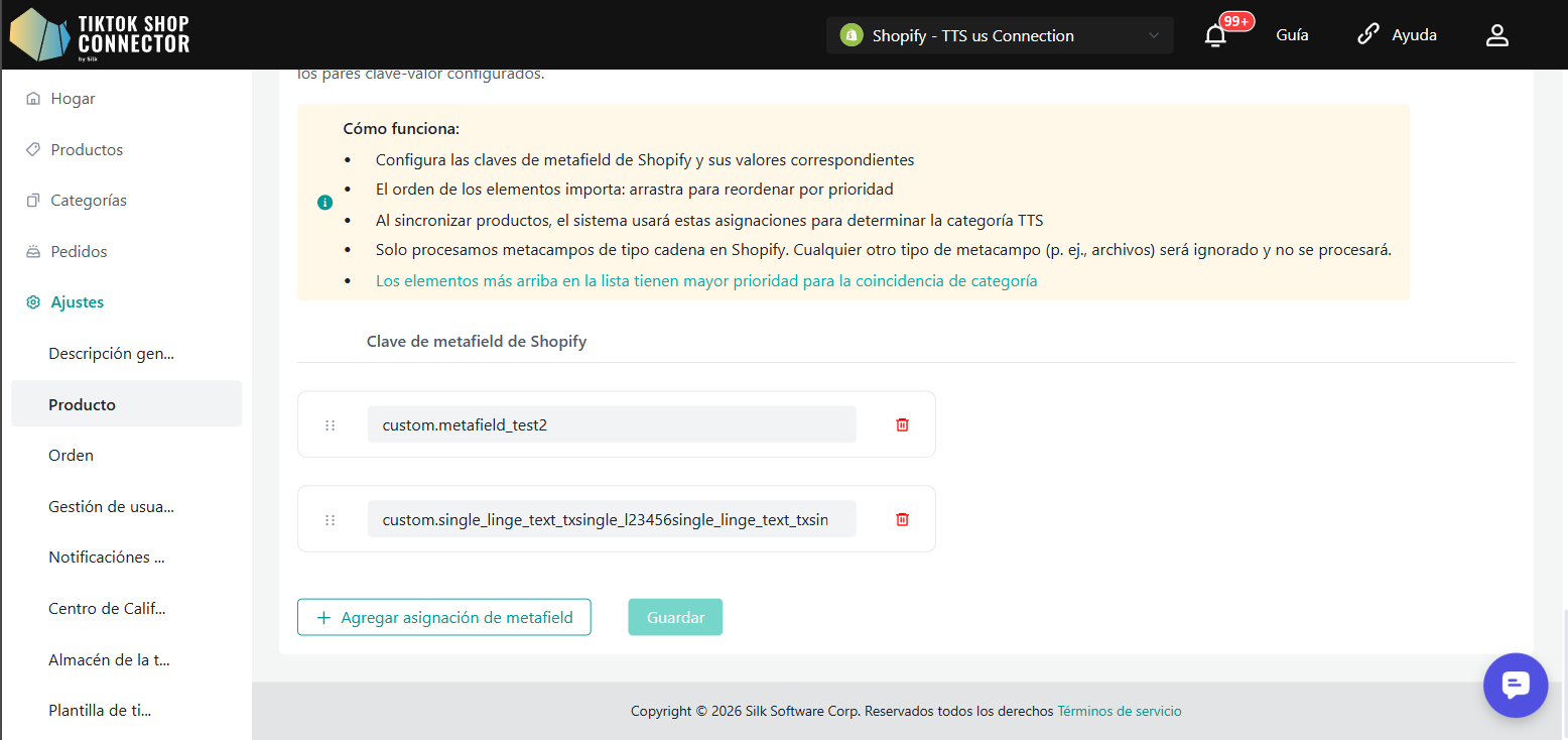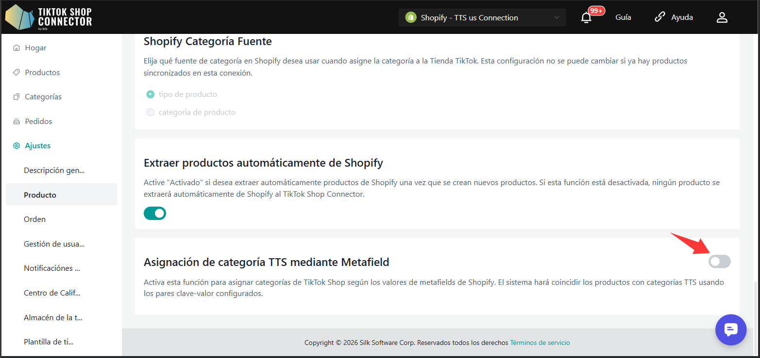 | Tipo de Producto/Categoría en Shopify | "Categoría en Shopify" para Connector by Silk |