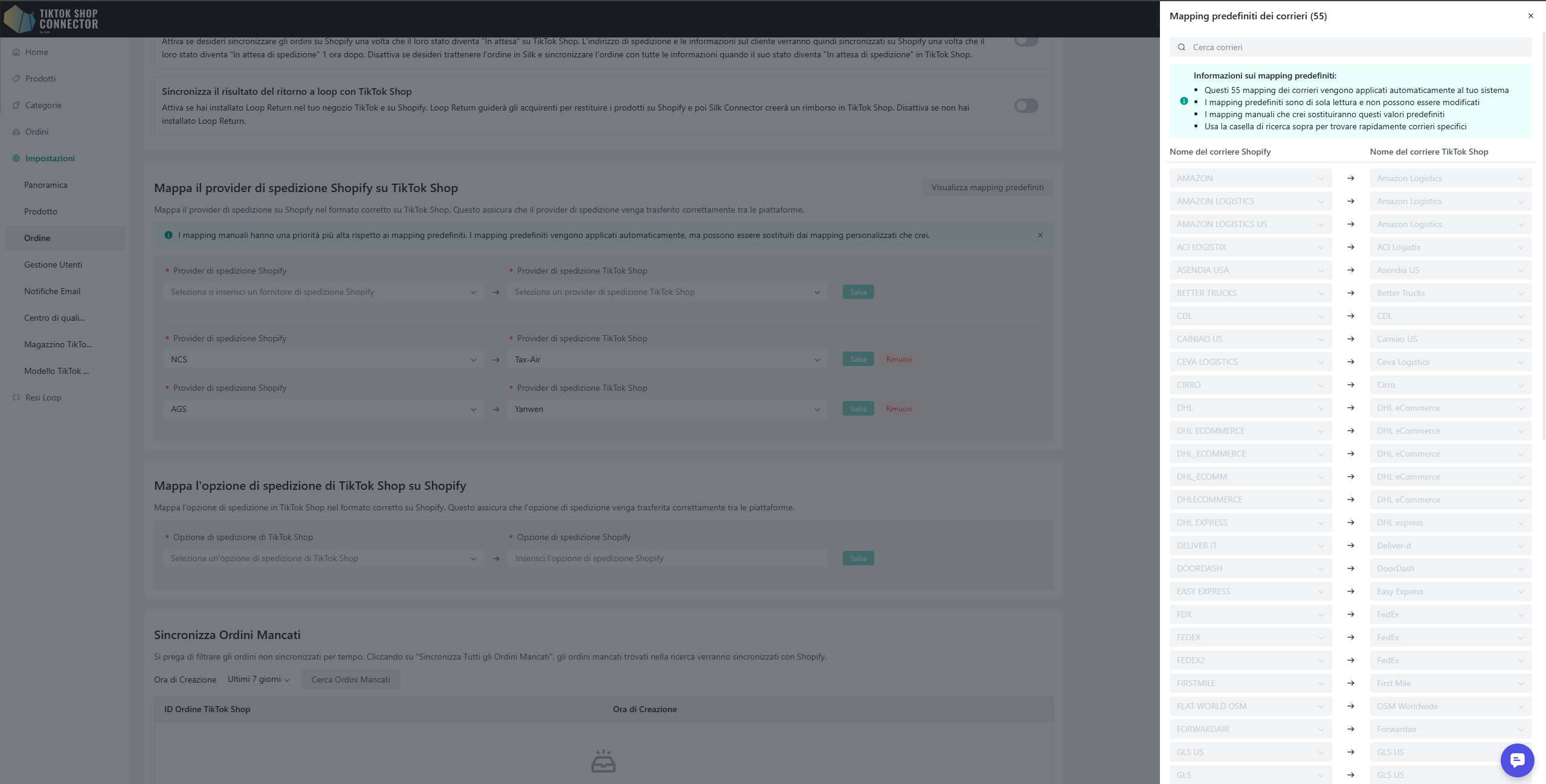 Nota: Per sincronizzare correttamente gli ordini da TikTok Shop a Shopify, i tuoi prodotti devono essere collegati da Shopify a TikTok Shop tramite il nostro Connector. Gli ordini che contengono prodotti non sincronizzati non verranno sincronizzati nuovamente con Shopify.