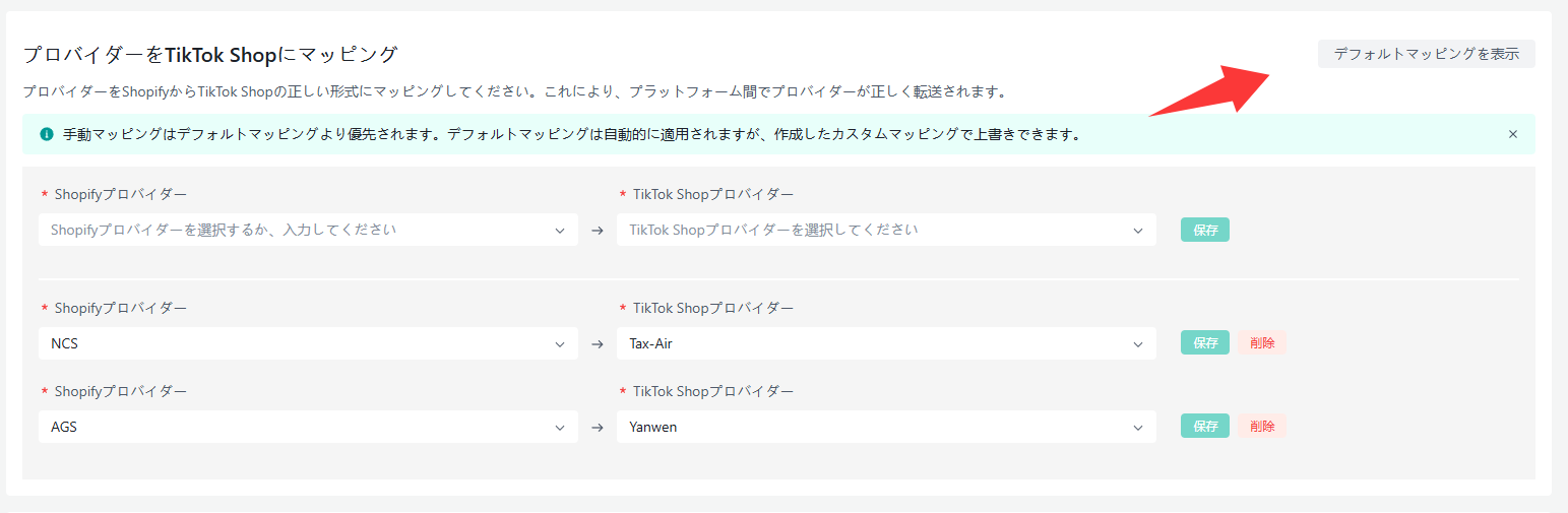| TikTok Shopが配送ステータスを追跡します。Shopifyから注文が出荷されると、輸送ステータスは自動的に'輸送中'に更新されます。 | 注文が配送されると、TikTok Shopストアの注文ステータスはデフォルトで'配送済み/完了'に更新されます。 |