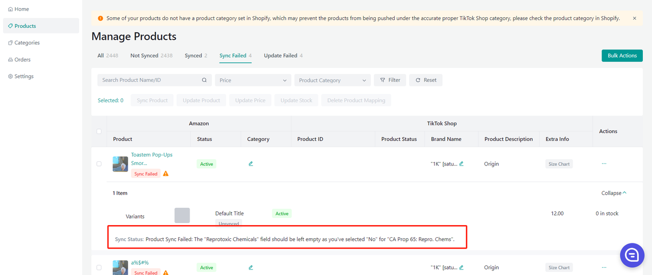 Jeśli produkt wymaga określonych certyfikatów lub atrybutów, aby mógł zostać przesłany do TikTok Shop, zobaczysz w „sync status” informację, że w produkcie brakuje plików certyfikatów lub atrybutów.