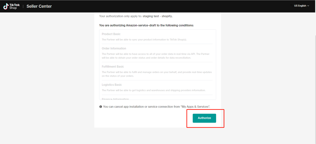 Kliknij „Cancel”, aby odinstalować usługę/aplikację TikTok Shop, którą chcesz anulować