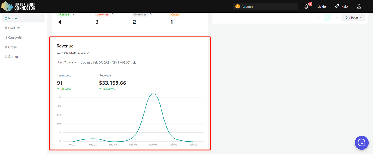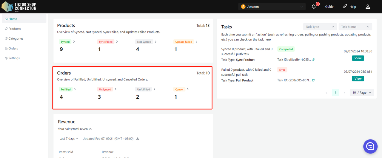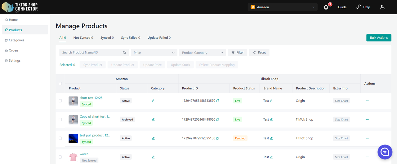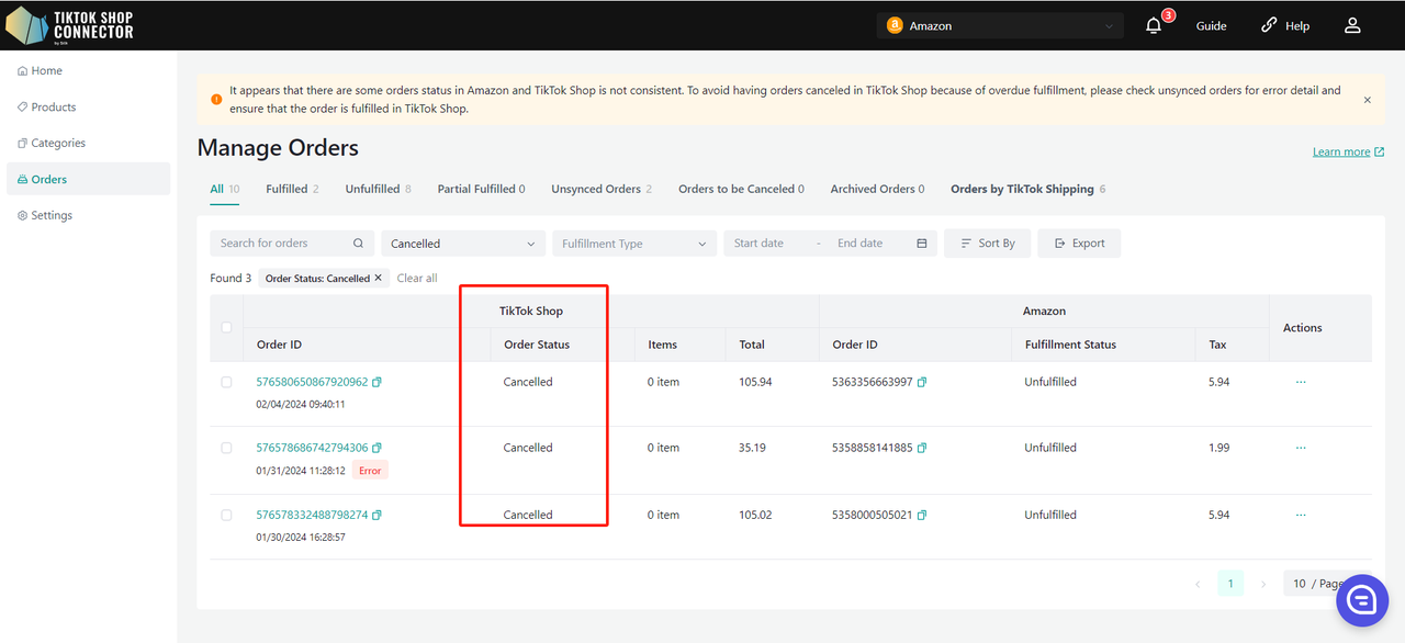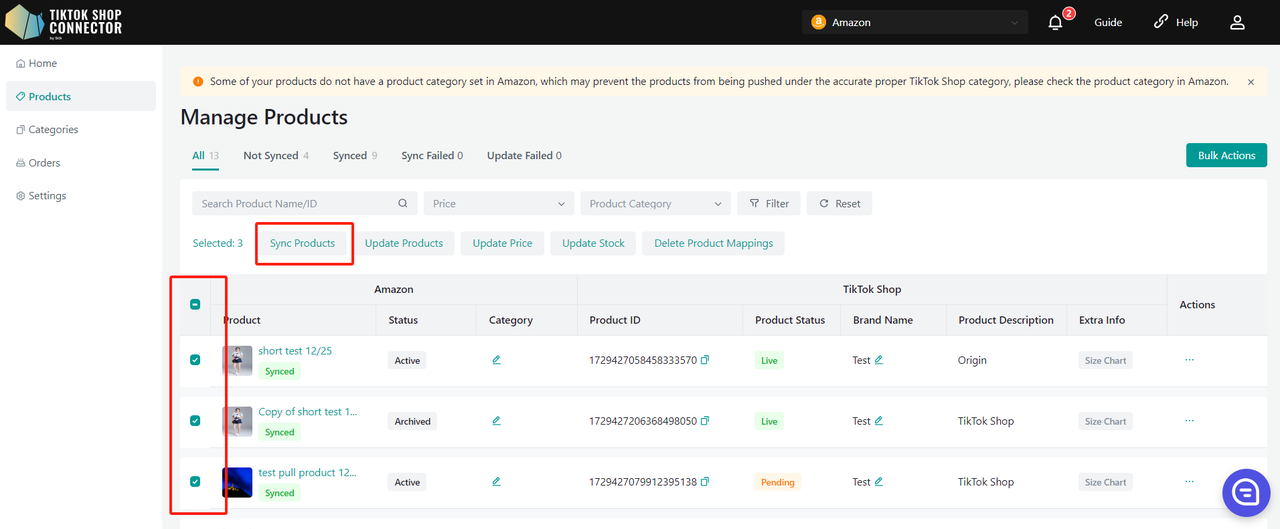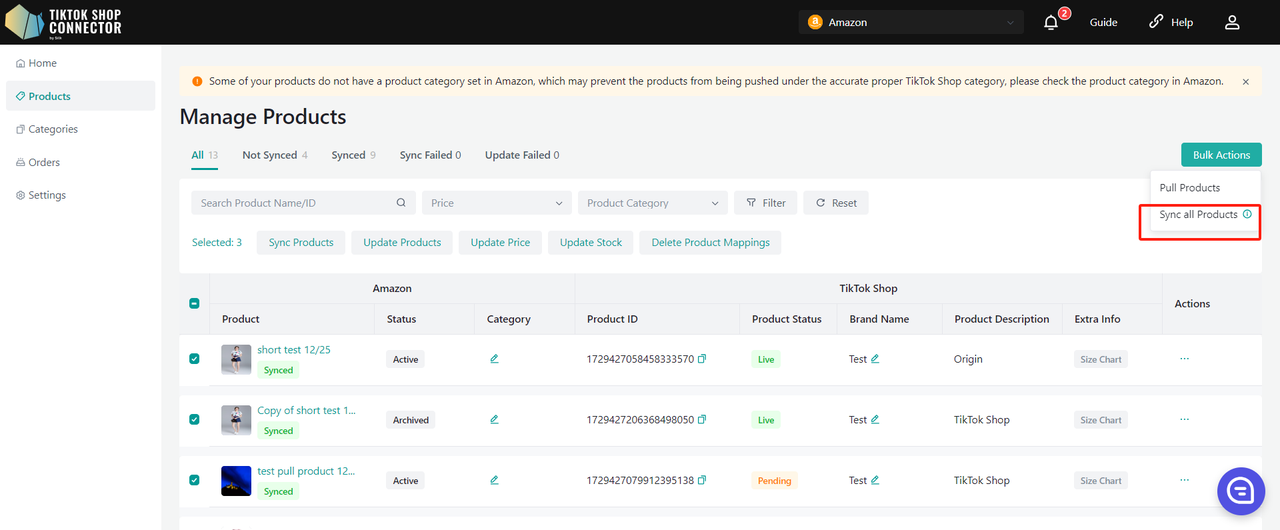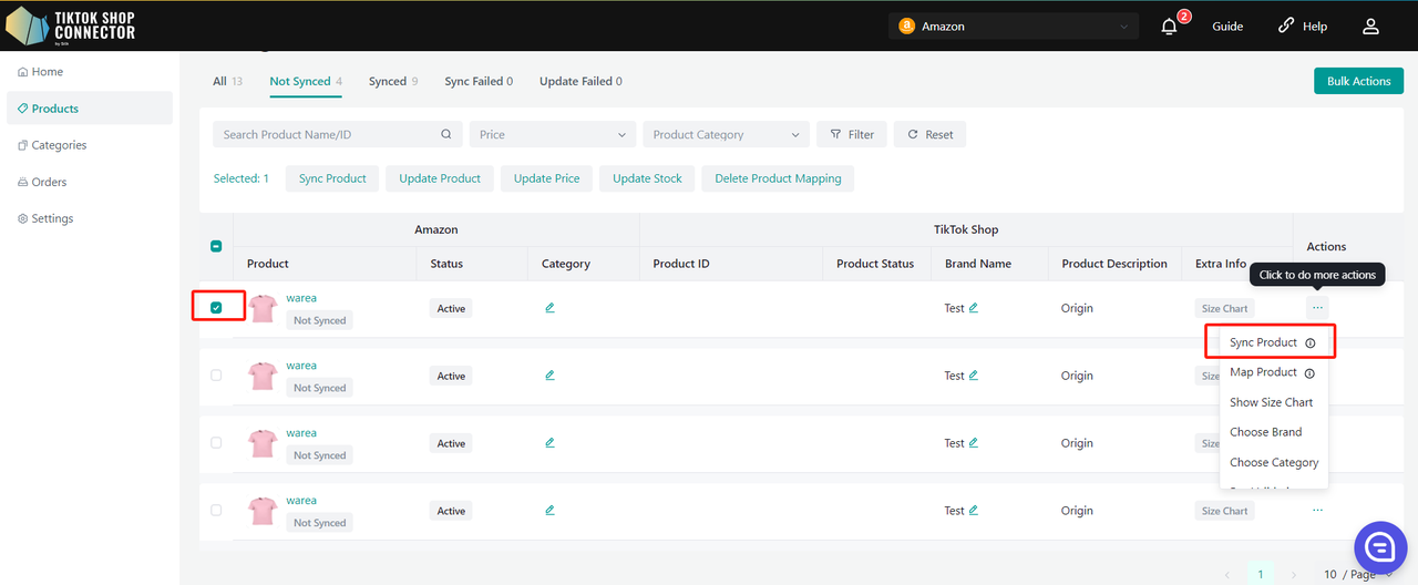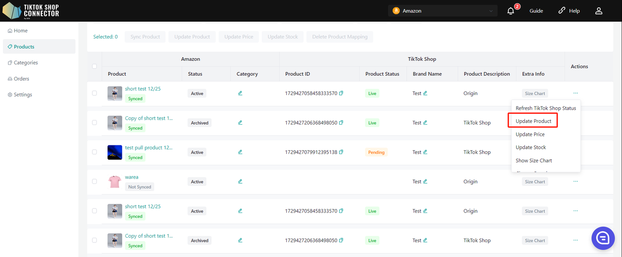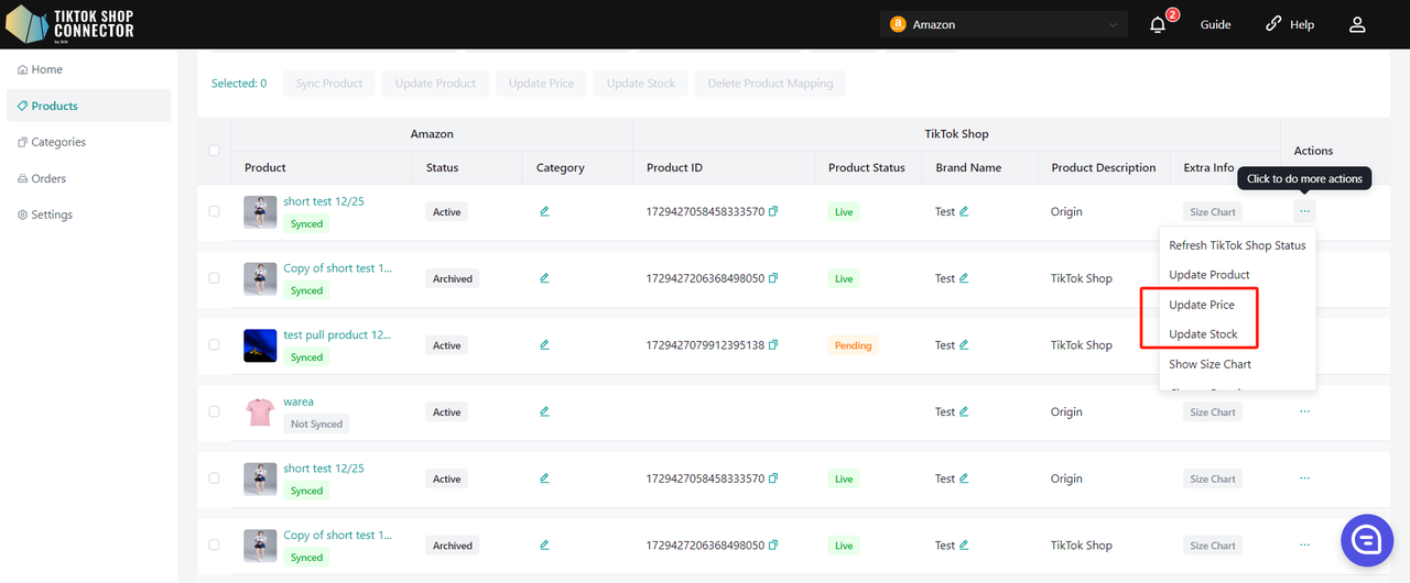Użyj „Update Stock” w Connectorze, jeśli zmiany stanu magazynowego w Amazon nie są widoczne w TikTok Shop.