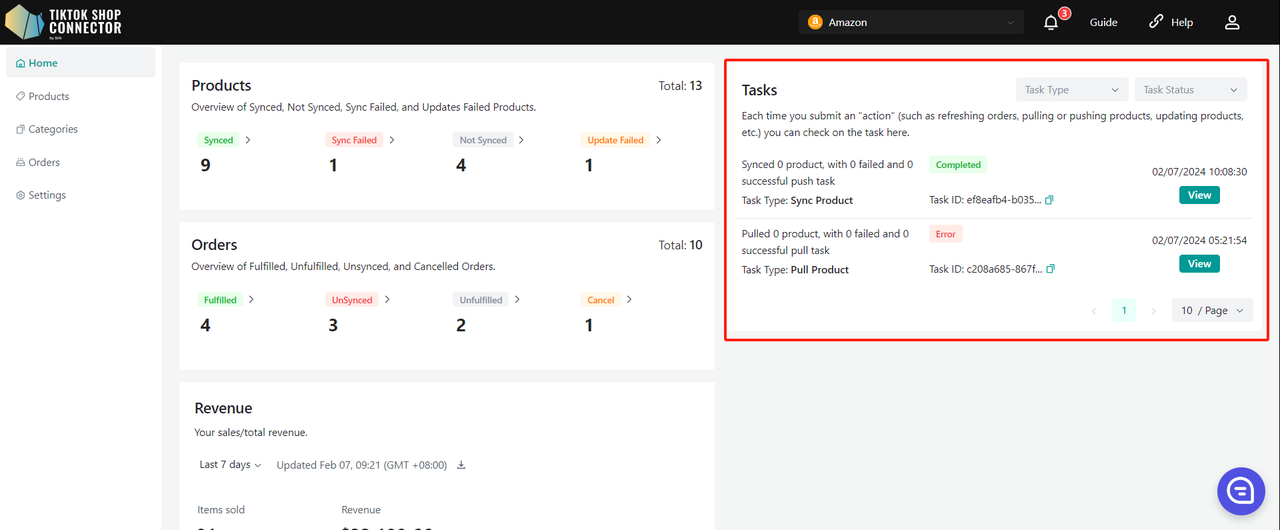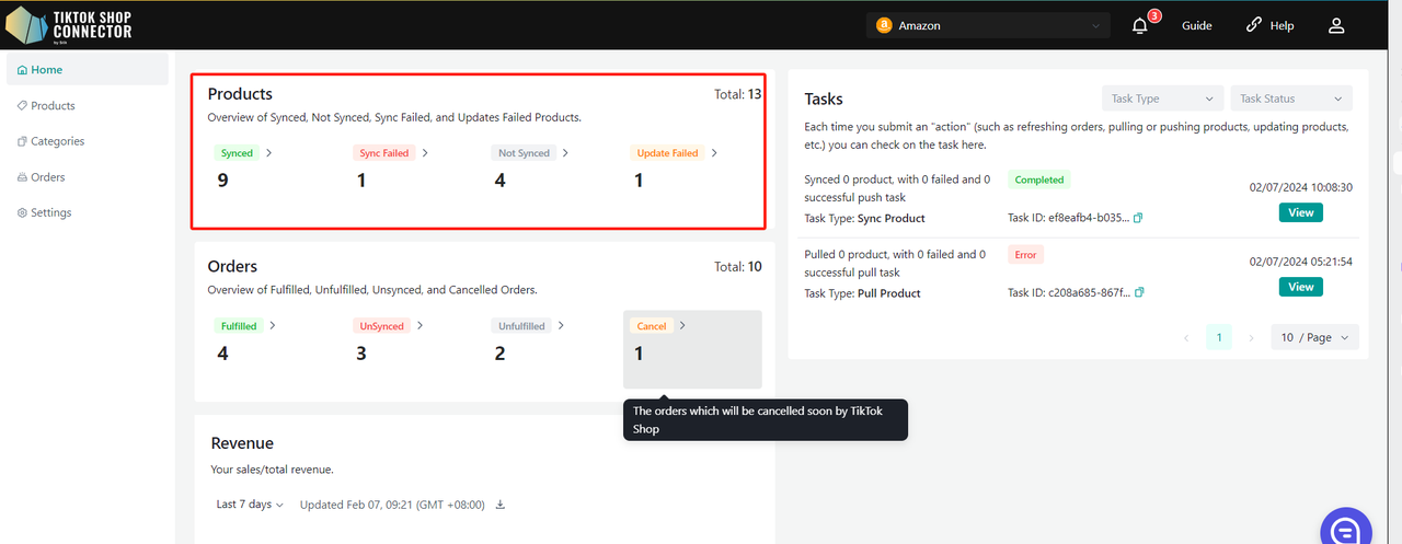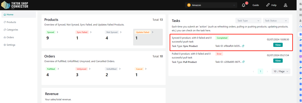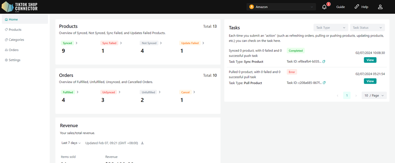 Gdy po raz pierwszy wejdziesz do nowego połączenia, zakładki Products i Dashboard będą puste. Musisz pierwszy raz „pull” produkty z Amazon do Connectora, a następnie „push” je do TikTok Shop.