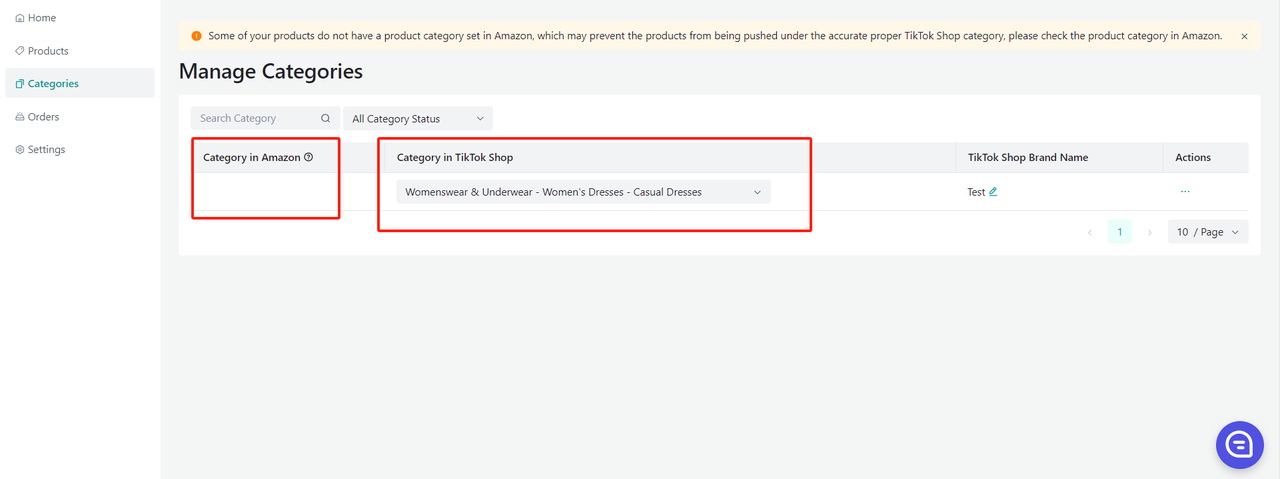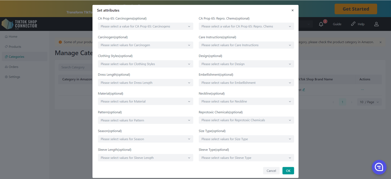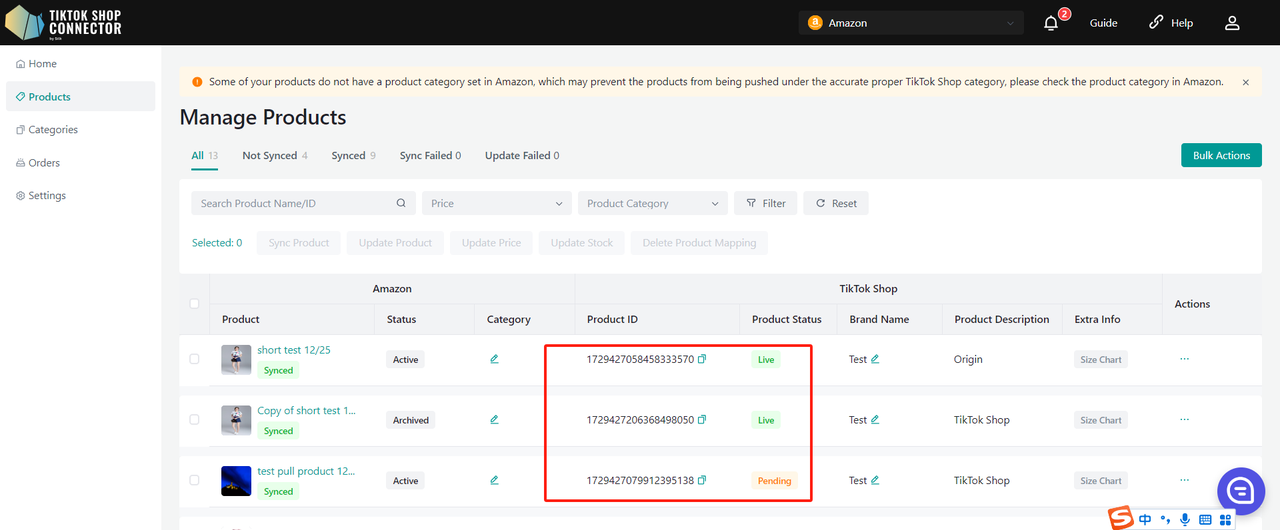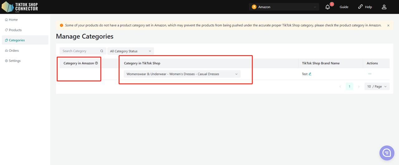 Wszystkie produkty muszą mieć w Amazon uzupełnione pole „product type”. Connector używa tego pola jako „Category in Amazon”, aby zmapować je do „Category in TikTok Shop”.