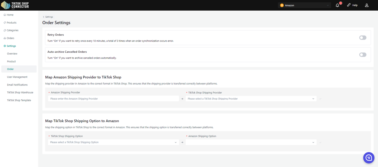- Shipping Provider Mapping: zmapuj przewoźnika wysyłki w Amazon do poprawnego formatu w TikTok Shop. Dzięki temu przewoźnik będzie poprawnie przenoszony między platformami.