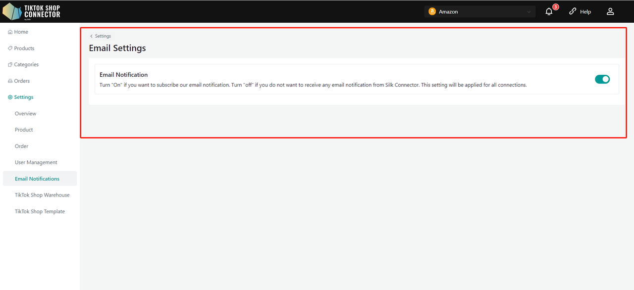 Push Products to all TikTok Shops: ustaw „On”, jeśli chcesz automatycznie wypychać te same produkty z Amazon do TikTok Shops. Jeśli ta funkcja jest wyłączona, możesz wypychać różne produkty z Amazon do różnych TikTok Shops.