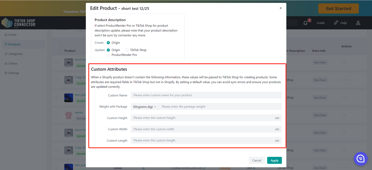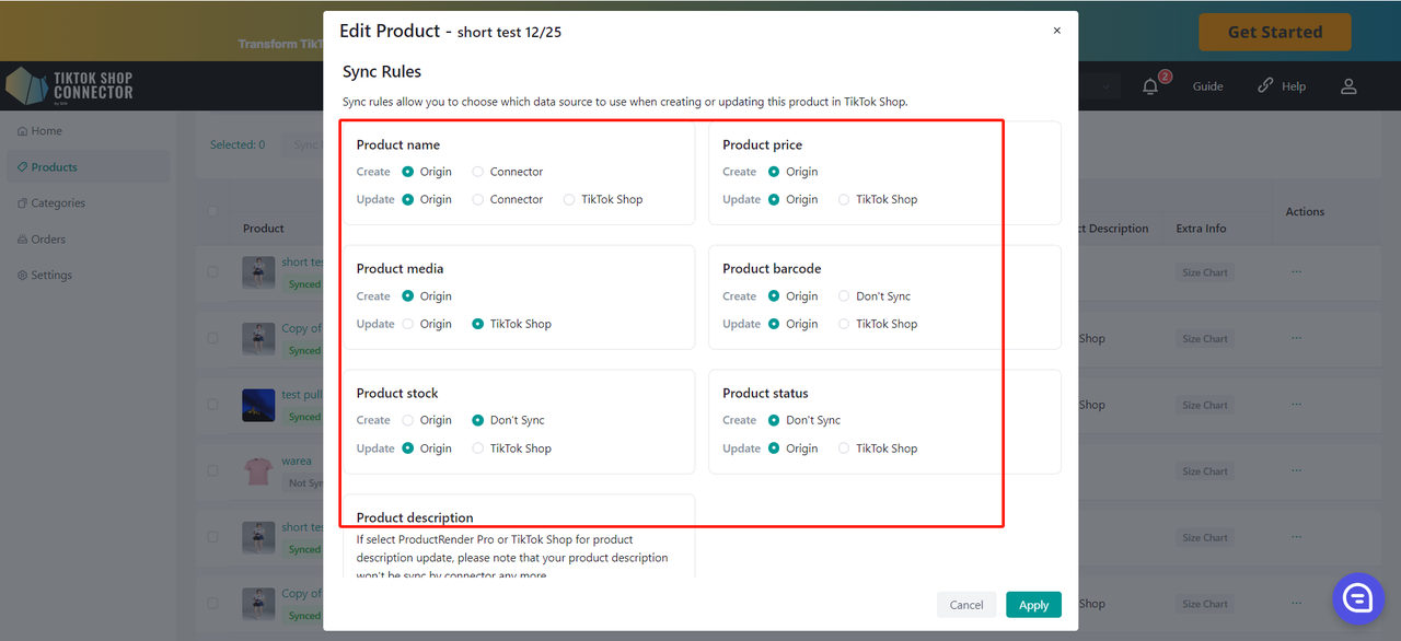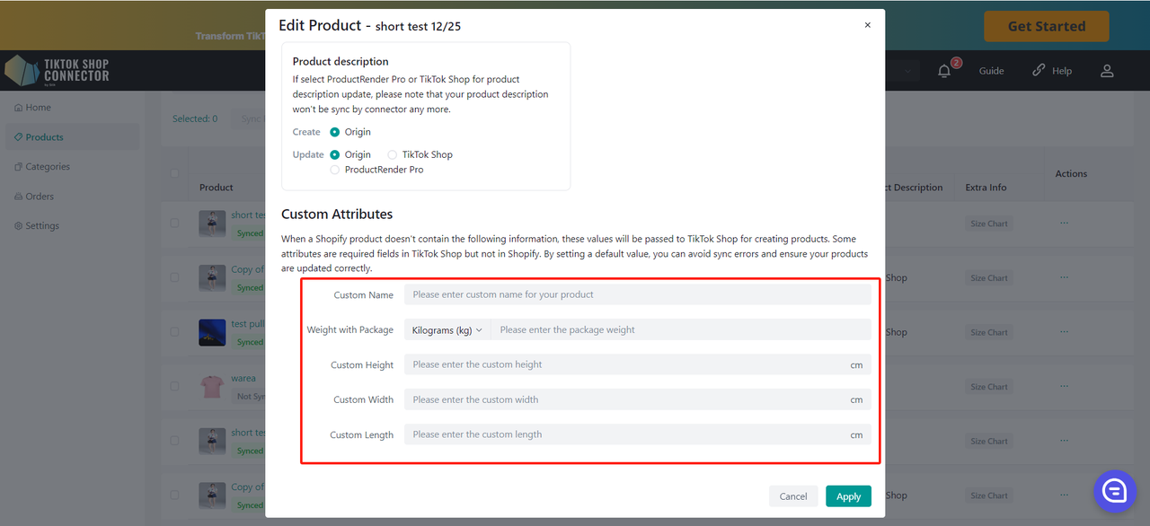 Aktualizacje wykonane w Connectorze Silk (przesyłanie certyfikatów, brandów, atrybutów, tabel rozmiarów) również muszą zostać zsynchronizowane do TikTok Shop.