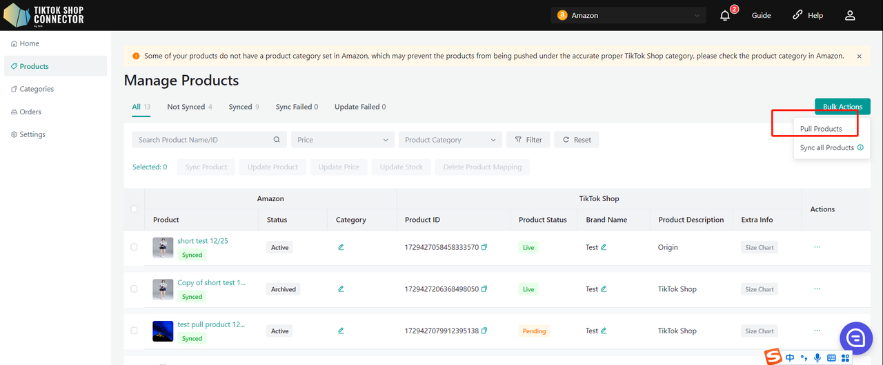 Products tab -> Actions -> Pull Products