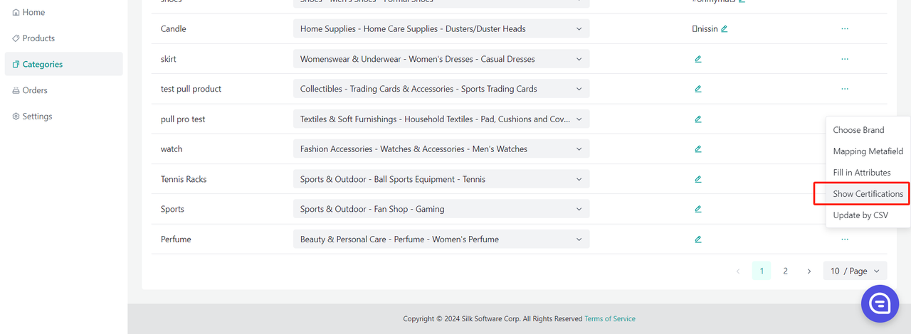 Aby przesłać certyfikat dla produktu: Kliknij (...) w sekcji „actions” dla kategorii, w której znajduje się produkt -> „show certifications”
