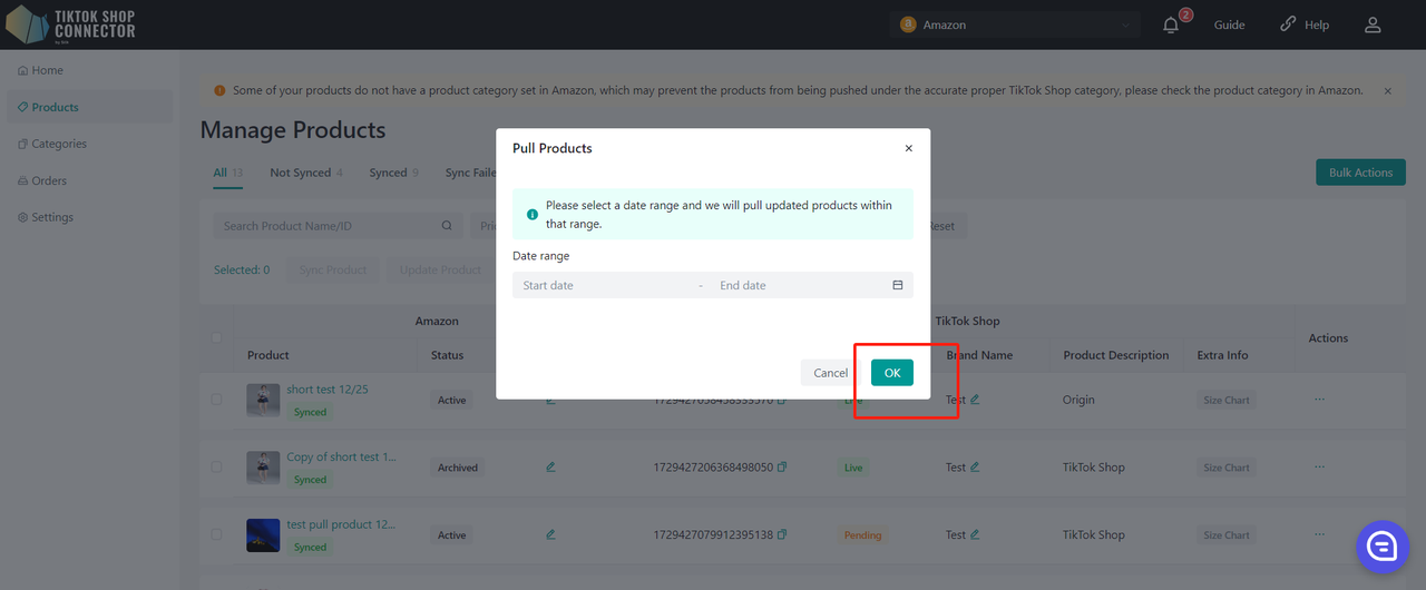 Jeśli pobierasz produkty po raz pierwszy, wybierz zakres dat sprzed kilku lat lub od momentu startu sklepu (to zapewnia, że wszystkie produkty zostaną pobrane do Connectora). Następnie wszelkie aktualizacje produktów w Amazon będzie trzeba pobierać dopiero od momentu ostatniej aktualizacji produktu.