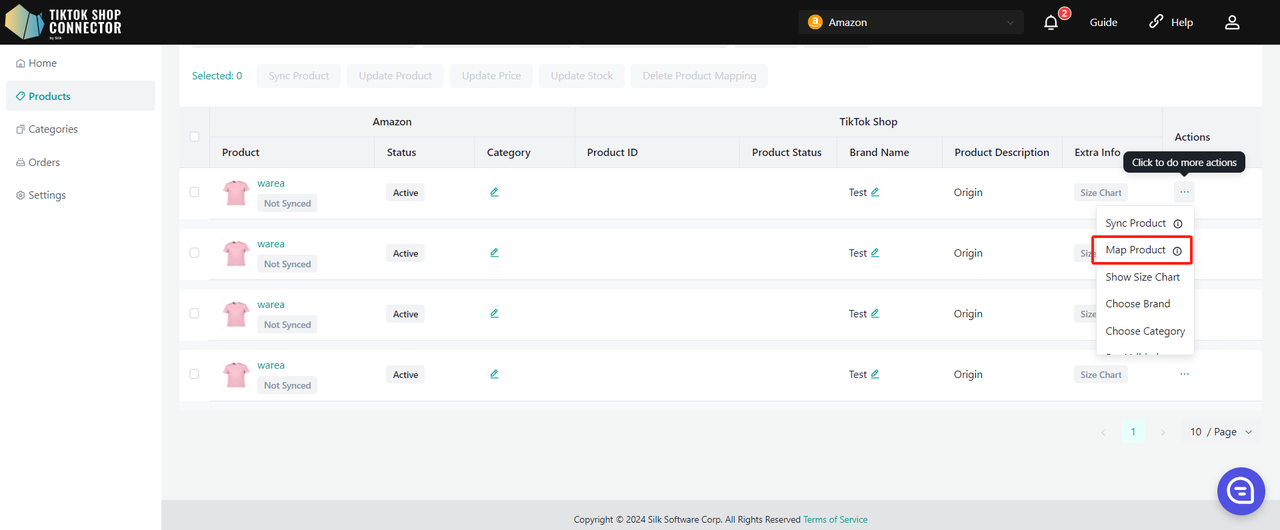 Kliknij (...) w kolumnie „Actions” obok produktu, który jest w TikTok Shop -> „Map Product”