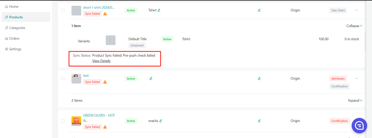 Jeśli produkty mają status „Sync Failed”, kliknij niebieską strzałkę obok zdjęcia produktu -> sprawdź „sync status”, aby zobaczyć powód niepowodzenia wypchnięcia.