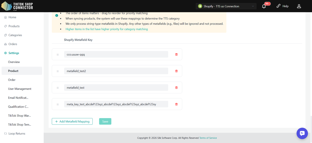 Wszystkie produkty muszą mieć w Shopify uzupełnione pole „product type/category”. Connector używa tego pola jako „Category in Shopify”, aby zmapować je na „Category in TikTok Shop”.
