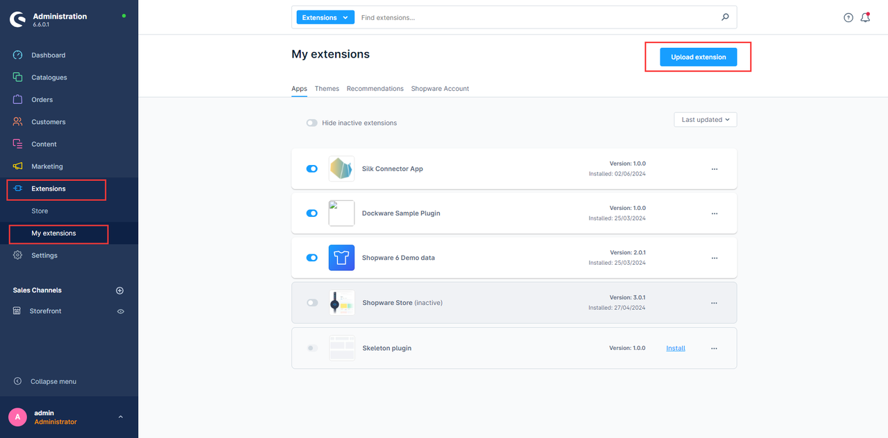 Prześlij pobrane rozszerzenie w Shopware: Extensions -> My extensions