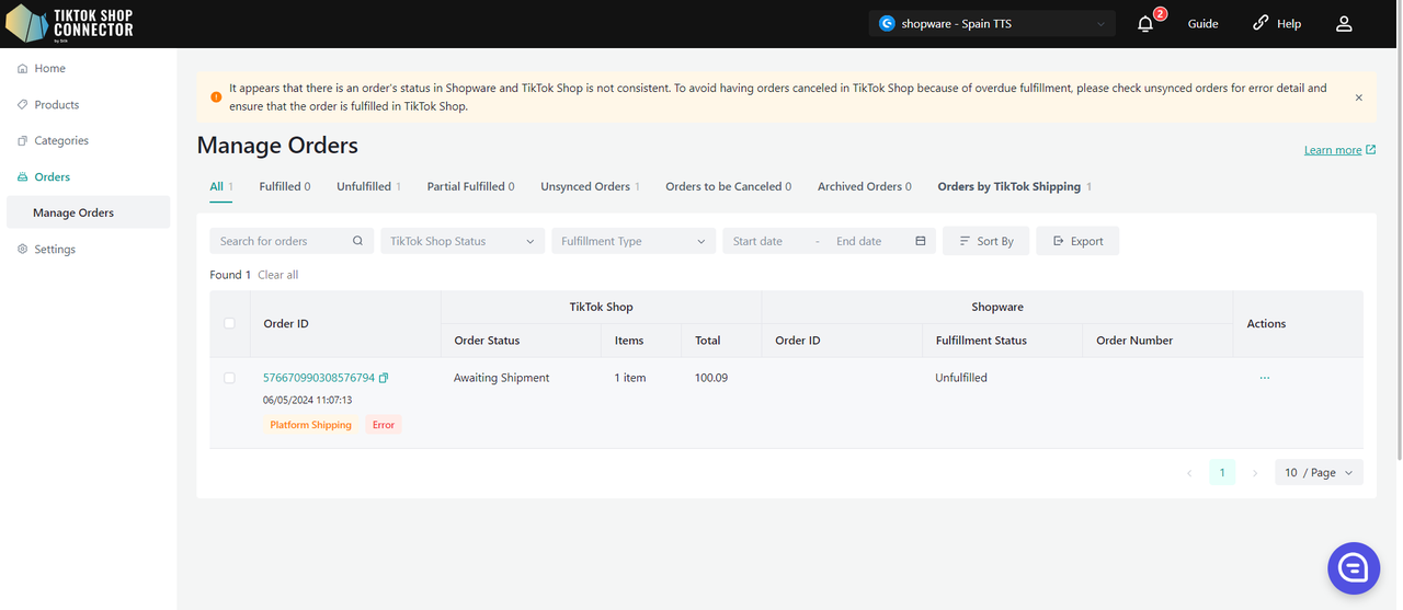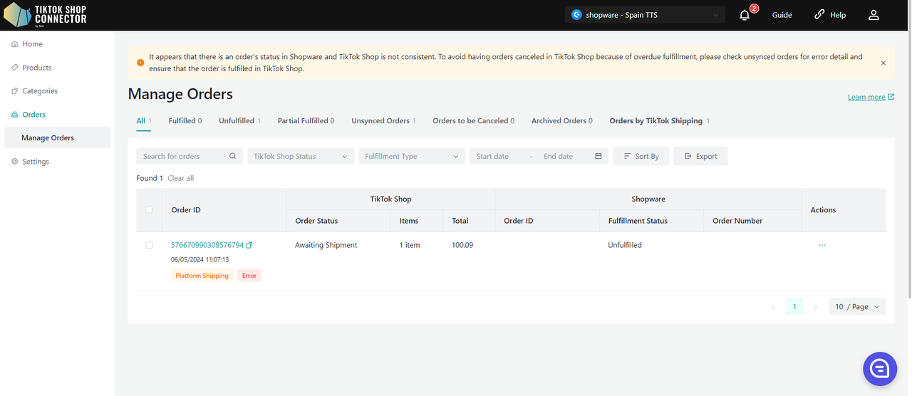 Uwaga: możemy wyszukiwać i synchronizować tylko zamówienia ze statusem "awaiting shipment". Zamówienie nie zostanie pobrane, jeśli w TikTok Shop ma już status awaiting collection, completed, cancelled itd.