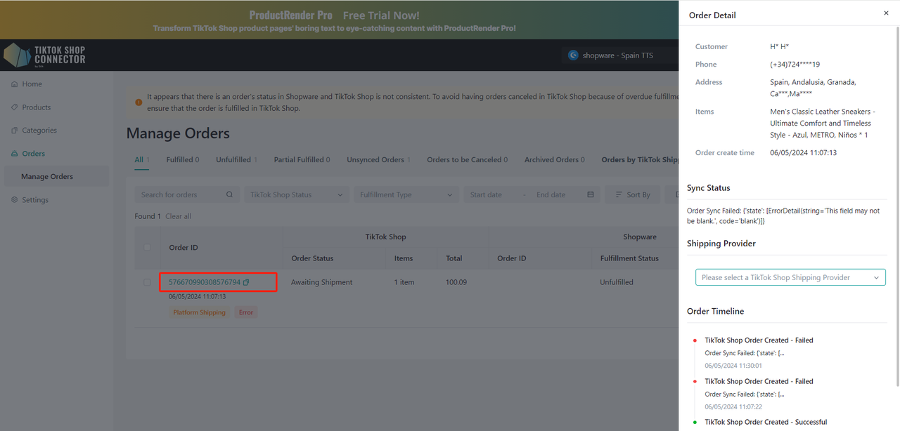 Jeśli produkt został "synced" do TikTok Shop, ale nie pojawia się w TikTok, sprawdź "sync status", aby zobaczyć komunikat błędu.