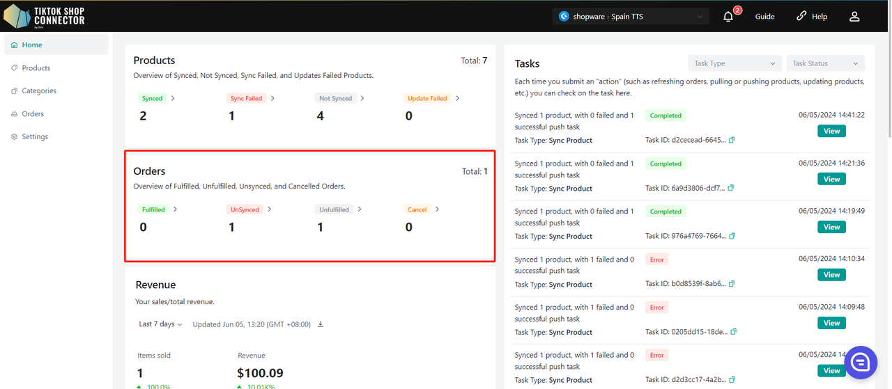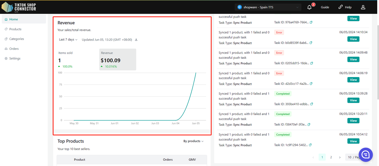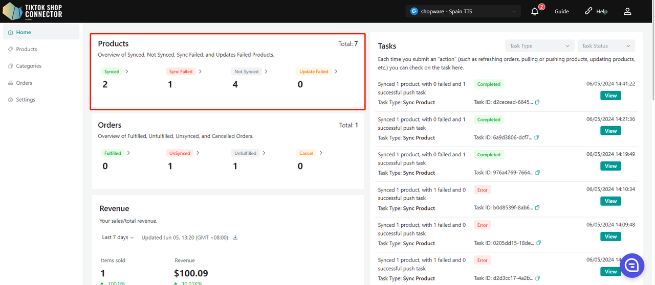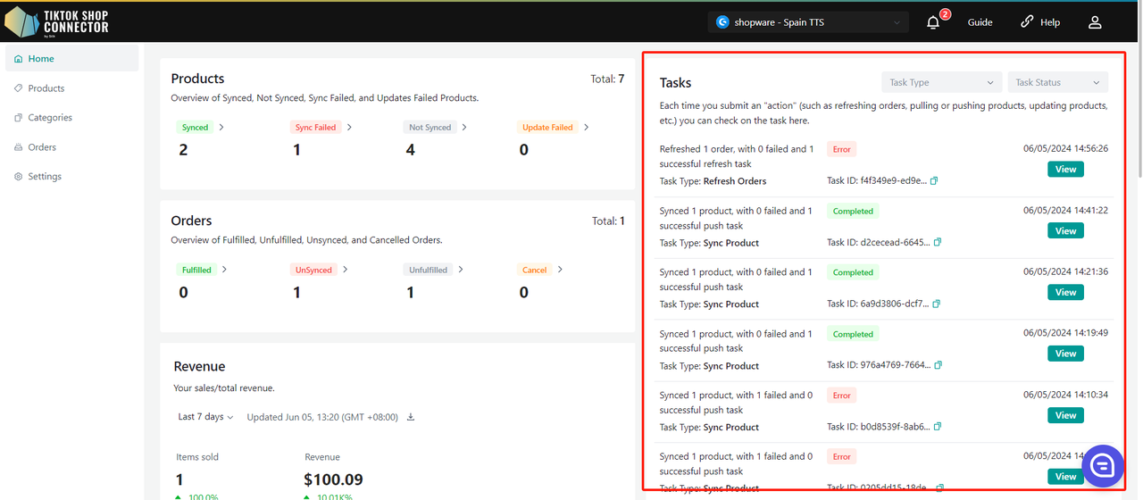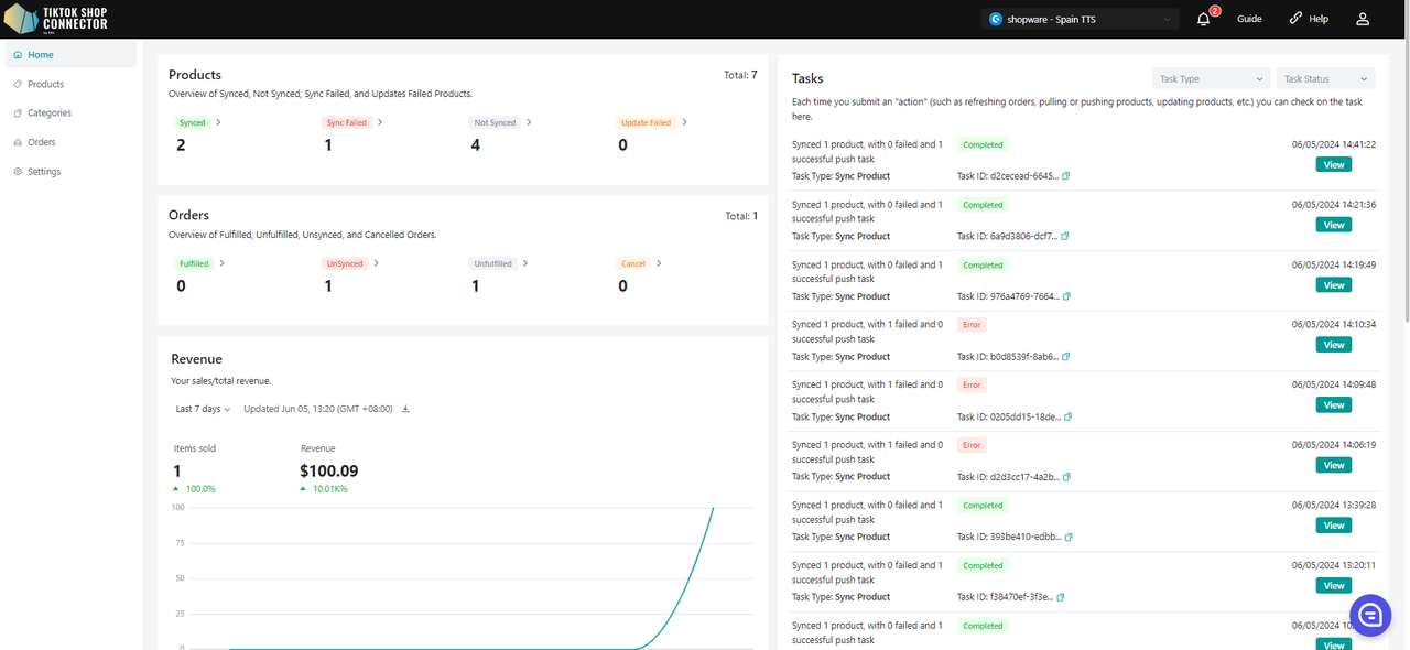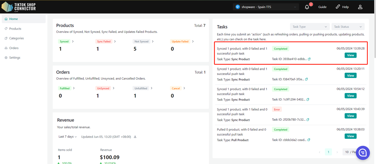 Uwaga: status "completed" NIE oznacza, że produkt został skutecznie zsynchronizowany do TikTok Shop. Oznacza jedynie, że akcja została wysłana, a "task" zakończony.