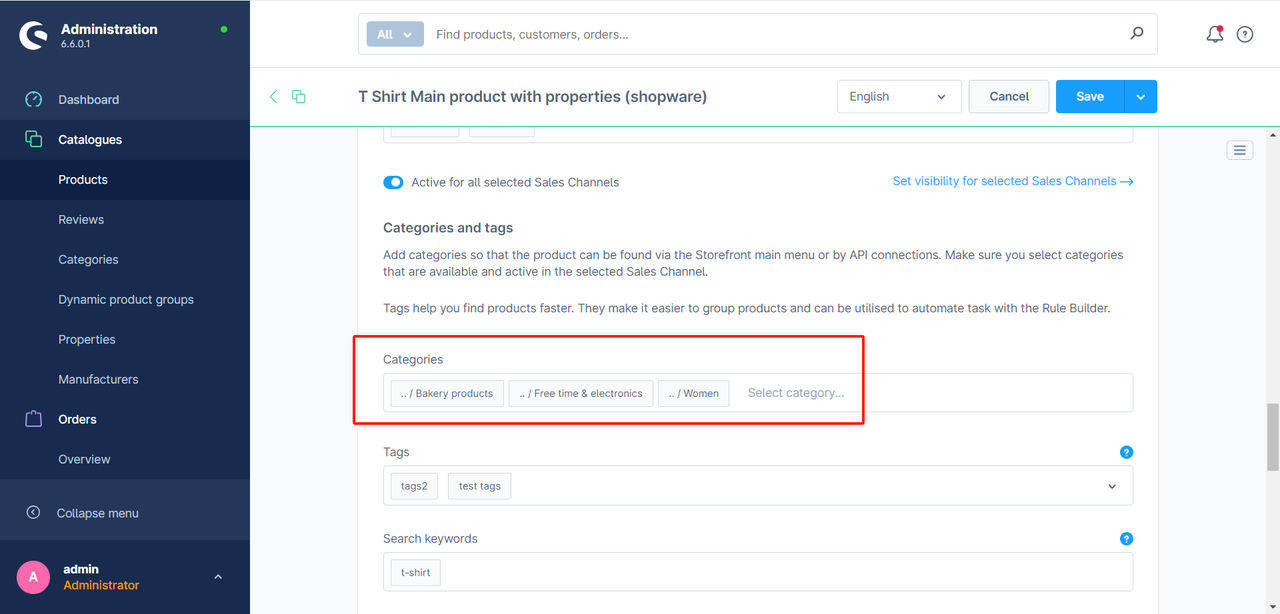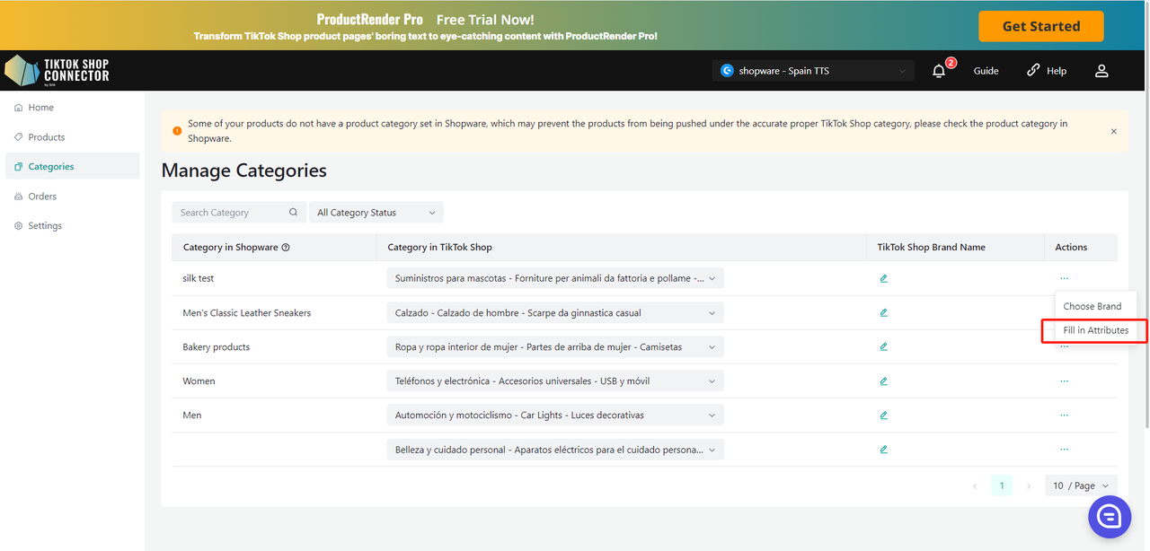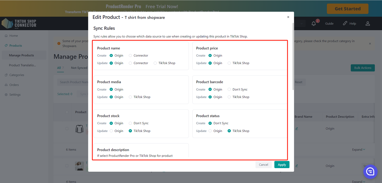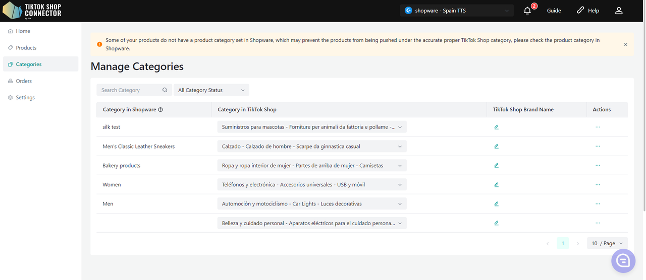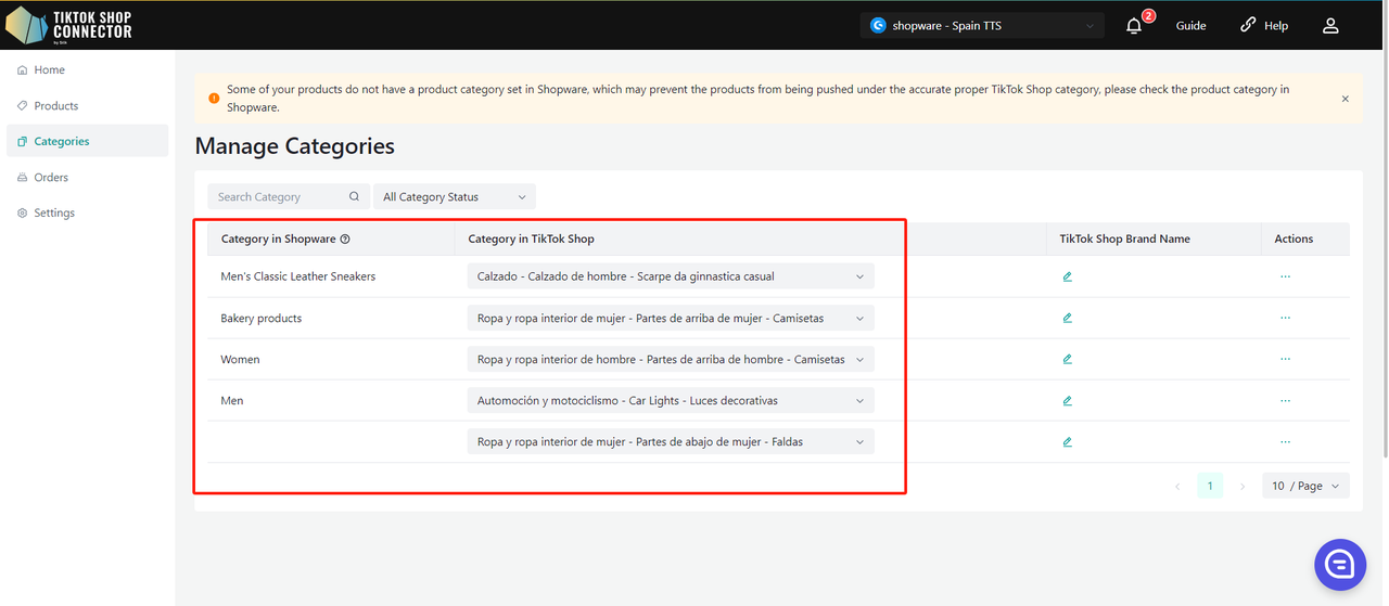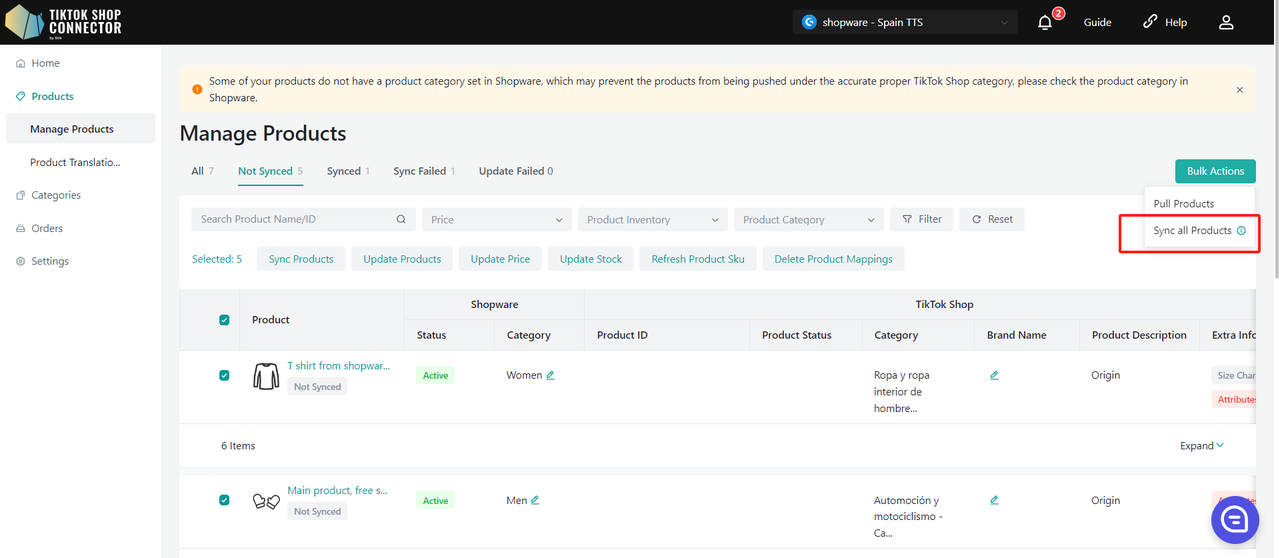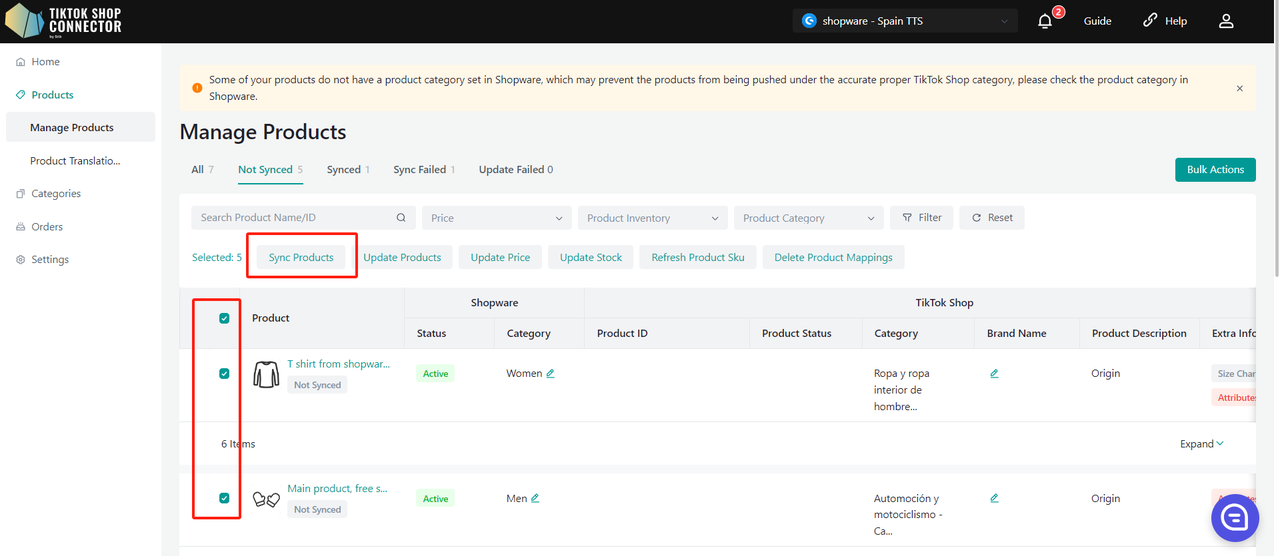 Wszystkie produkty muszą mieć w Shopware uzupełnione pole "product type". Connector wykorzystuje to pole jako "Category in Shopware", aby zmapować je do "Category in TikTok Shop".
