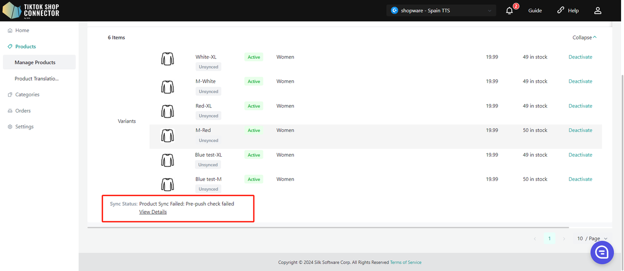 Kliknij ten link (https://seller-us.tiktok.com/product/manage), aby zobaczyć zsynchronizowany produkt w TikTok Shop Seller Center.