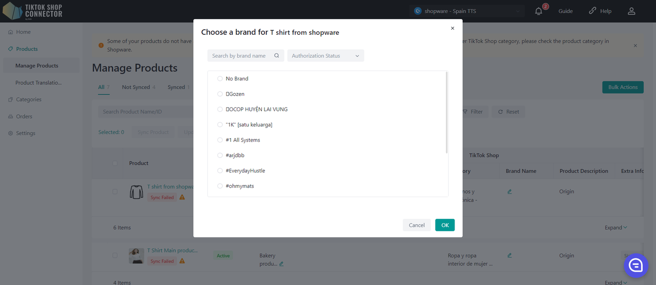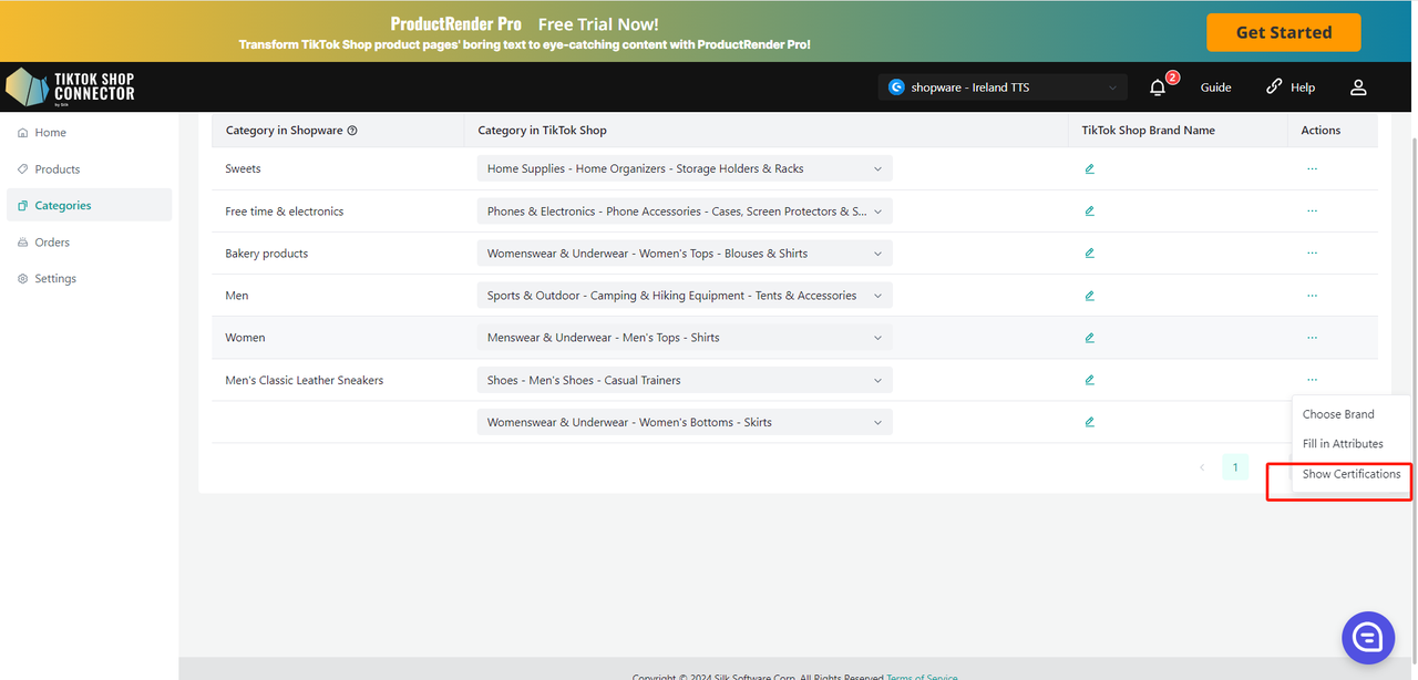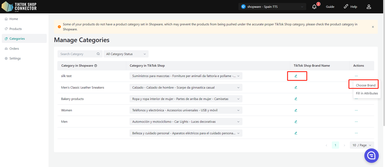 Aktualizacje wykonane w Connector by Silk (przesłanie certyfikatów, marek, atrybutów, tabel rozmiarów) również muszą zostać zsynchronizowane do TikTok Shop.