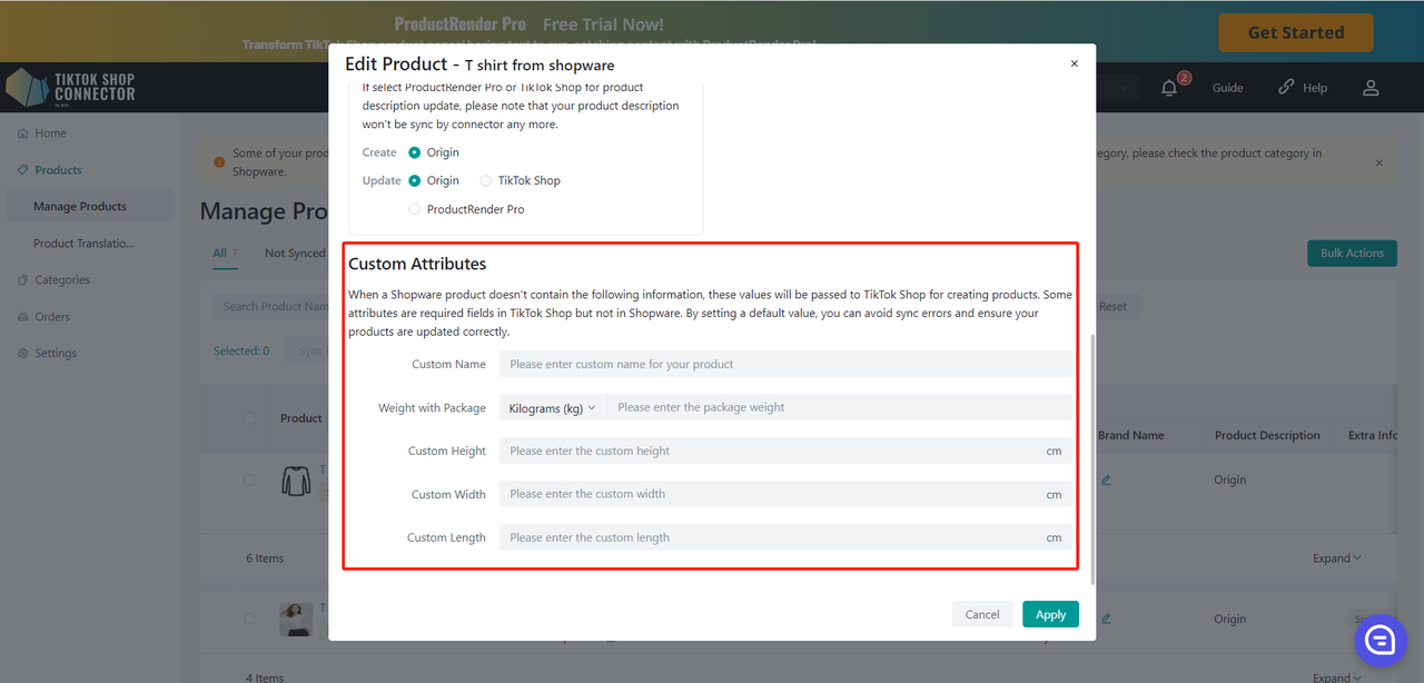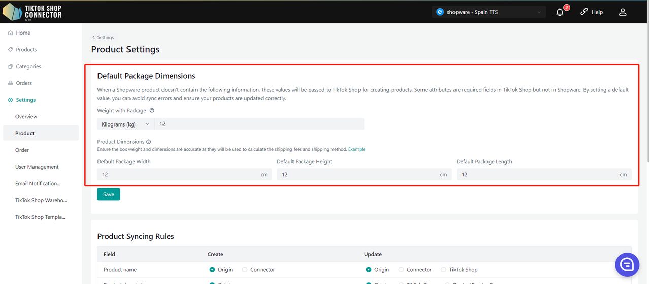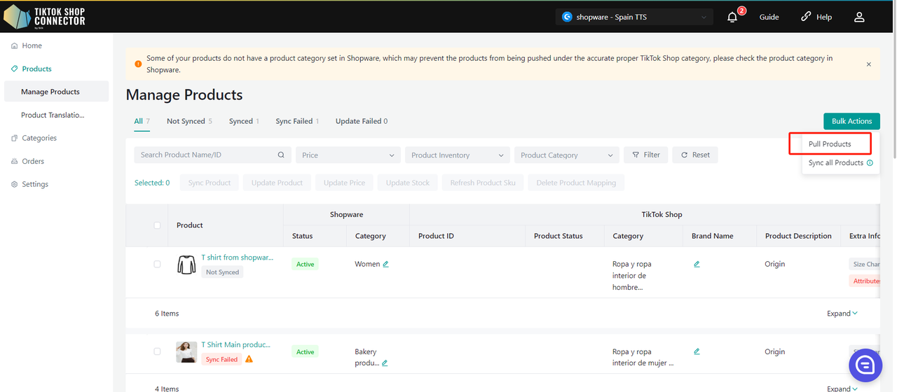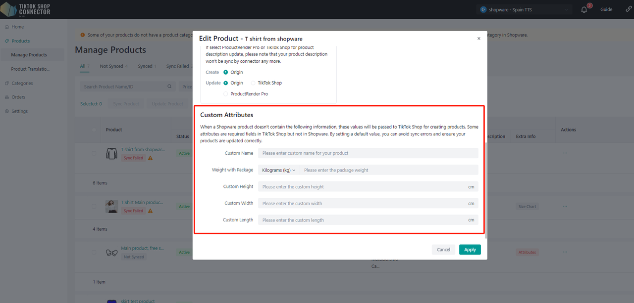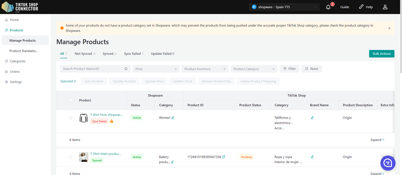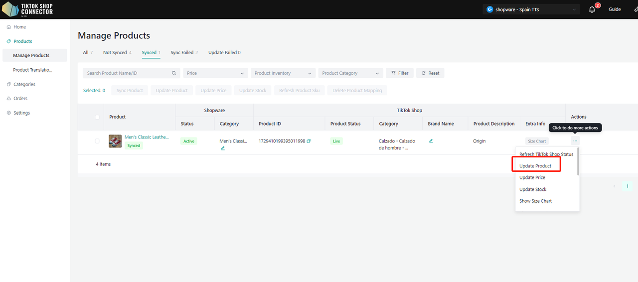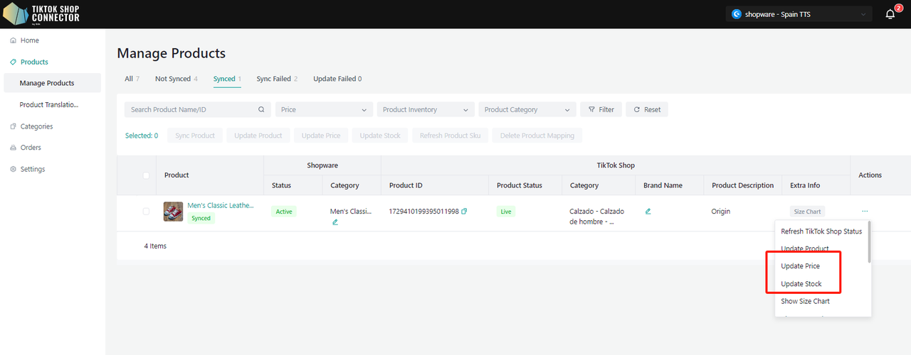 "Update Price" i "Update Stock" w Connectorze, jeśli zmiany ceny lub stanu w Shopware nie są widoczne w TikTok Shop."