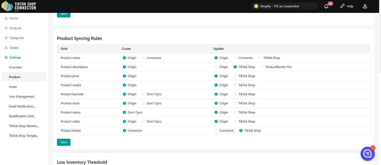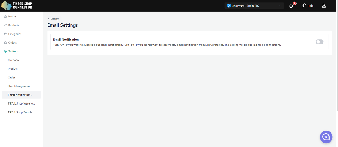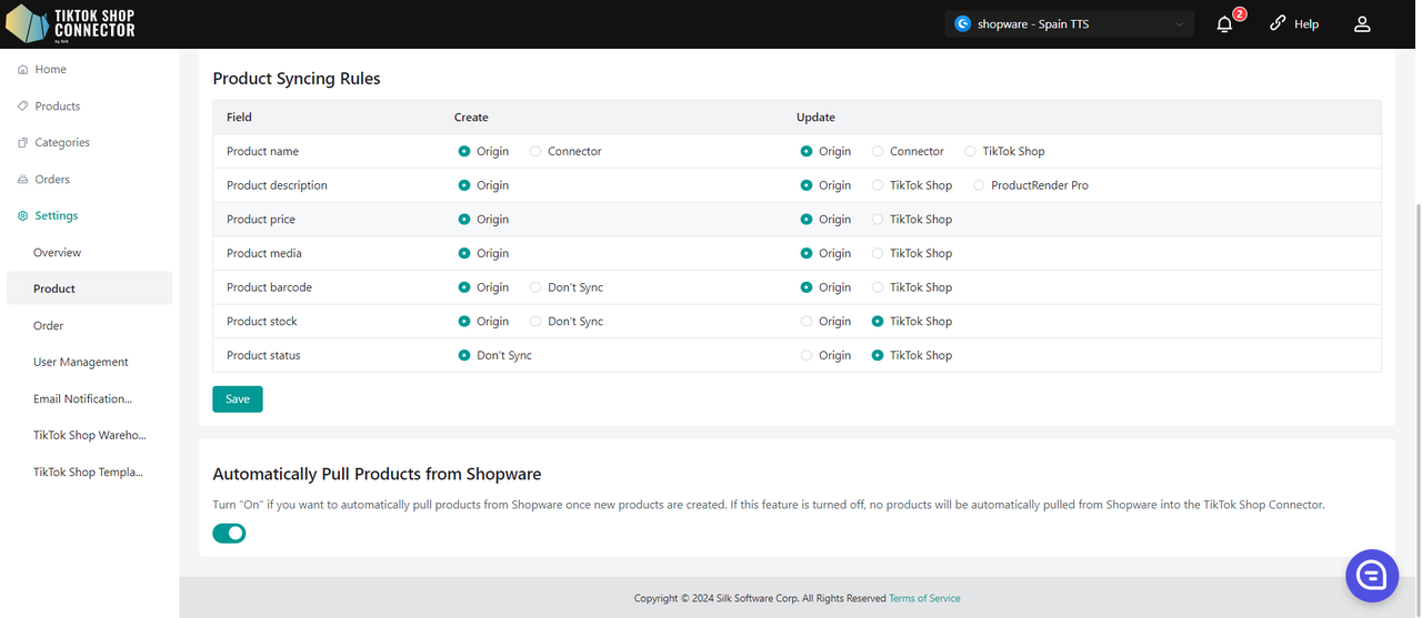 Włącz ("On"), jeśli chcesz automatycznie pobierać produkty z Shopware po utworzeniu nowych produktów. Jeśli ta funkcja jest wyłączona, produkty nie będą automatycznie pobierane z Shopware do TikTok Shop Connector.