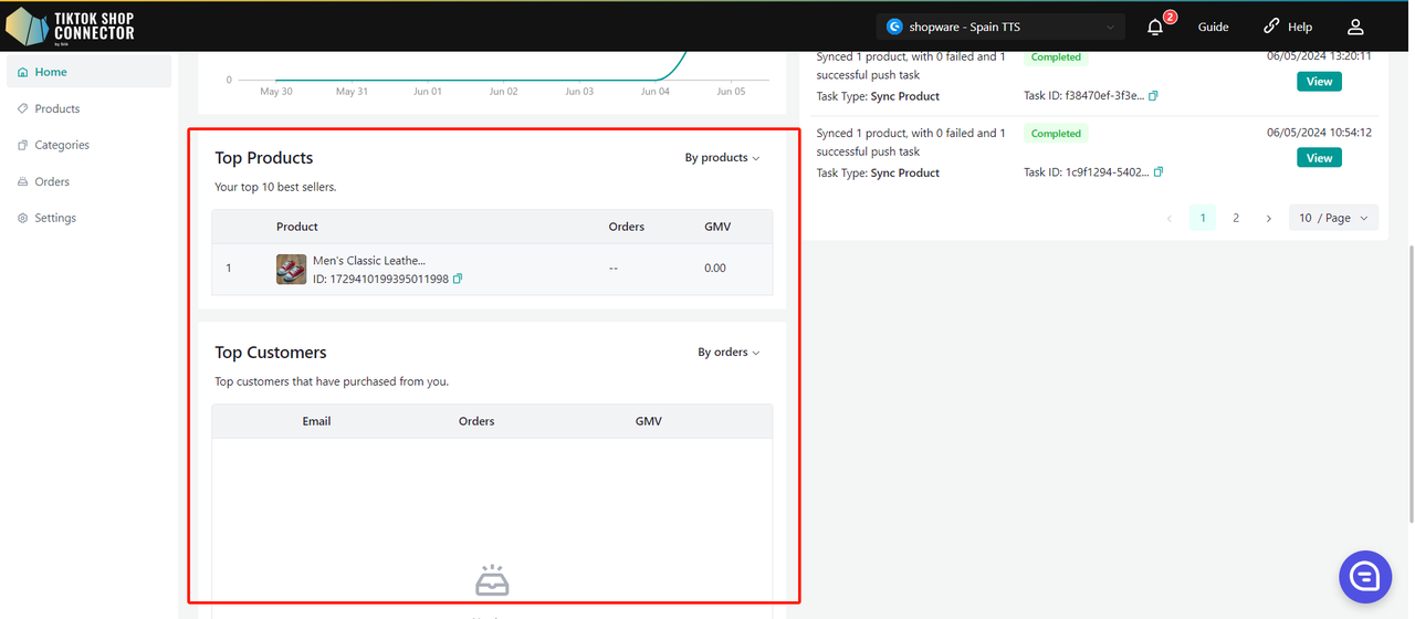 Gdy po raz pierwszy wejdziesz do nowego połączenia, zakładki Products i Dashboard będą puste. Najpierw musisz wykonać "pull" (pobrać) produkty z Shopware do Connectora, a następnie "push" (wypchnąć) je do TikTok Shop.