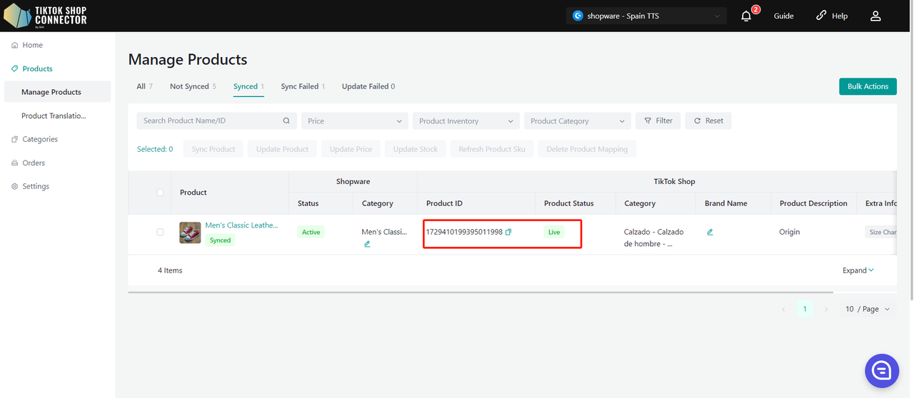 Jeśli produkt ma status "synced" i posiada "TTS Product ID" oraz "TTS Product Status", oznacza to, że produkt został skutecznie wypchnięty do TikTok Shop.