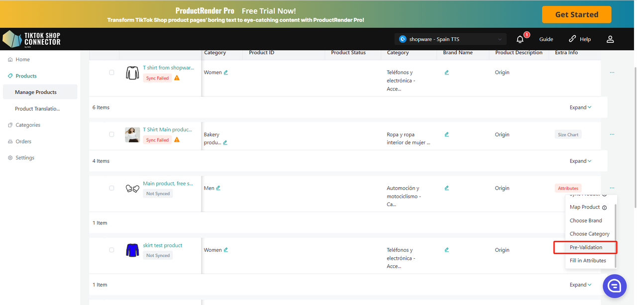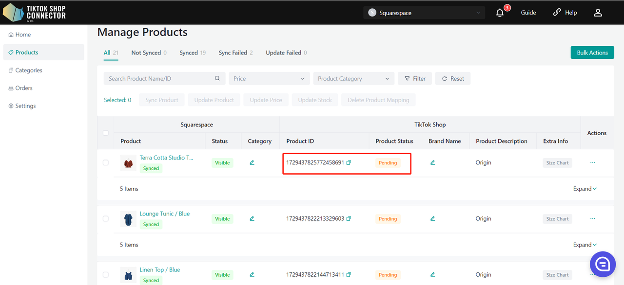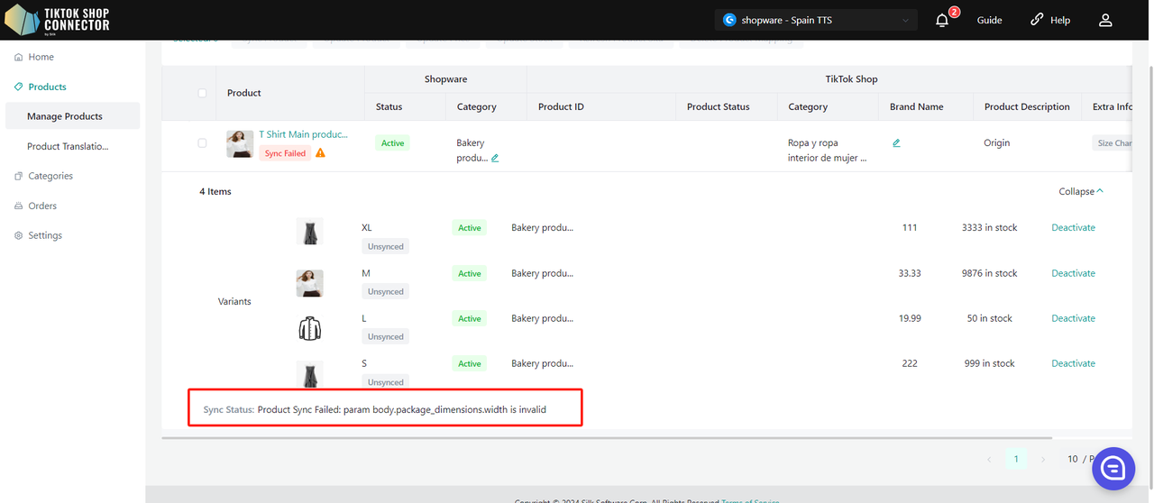 Jeśli produkt ma status "Synced Failed", kliknij "Expand" -> sprawdź "sync status", aby zobaczyć powód niepowodzenia.