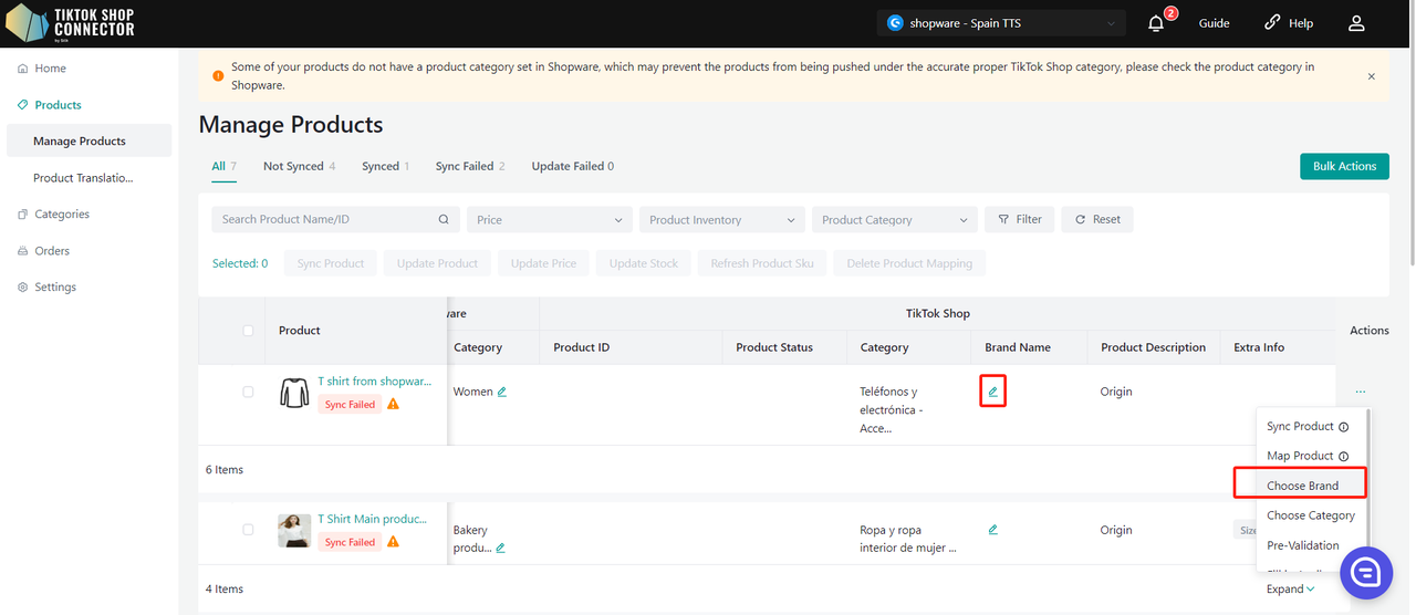 Jeśli produkty mają status "Sync Failed", kliknij "Expand" -> sprawdź "sync status", aby zobaczyć powód niepowodzenia.