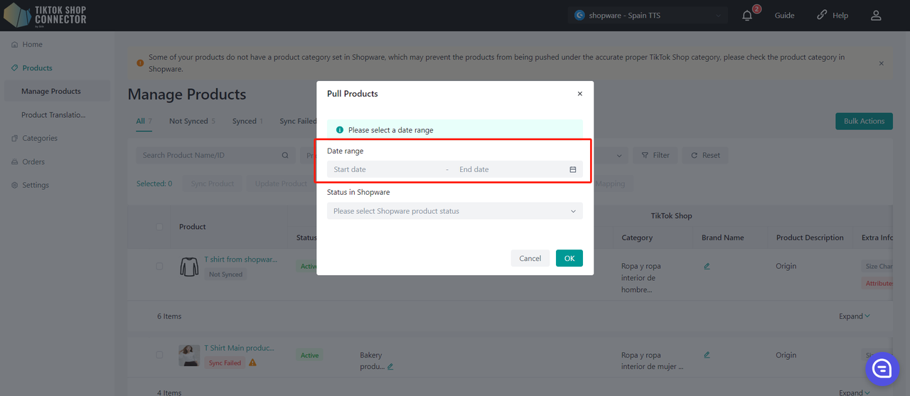 Wybierz zakres dat, z którego mają zostać pobrane produkty z Shopware.