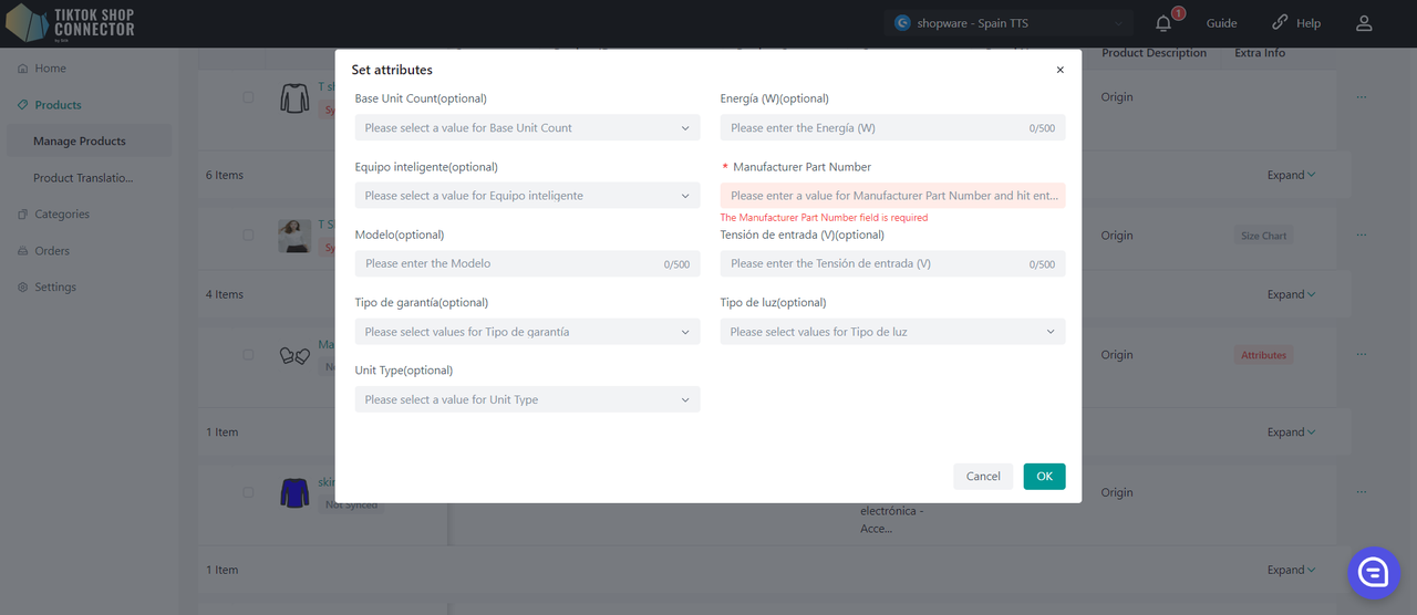 Jeśli produkt wymaga określonych certyfikatów lub atrybutów, aby mógł zostać przesłany do TikTok Shop, zobaczysz w "sync status" informację o brakujących plikach certyfikatów lub atrybutach.