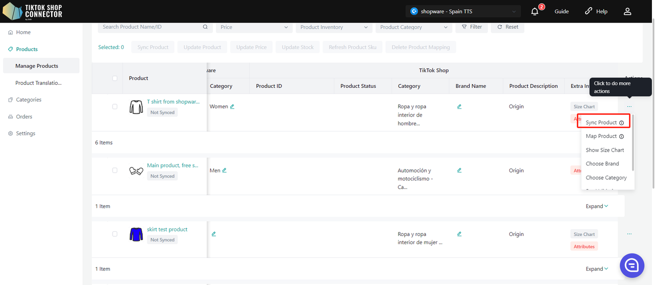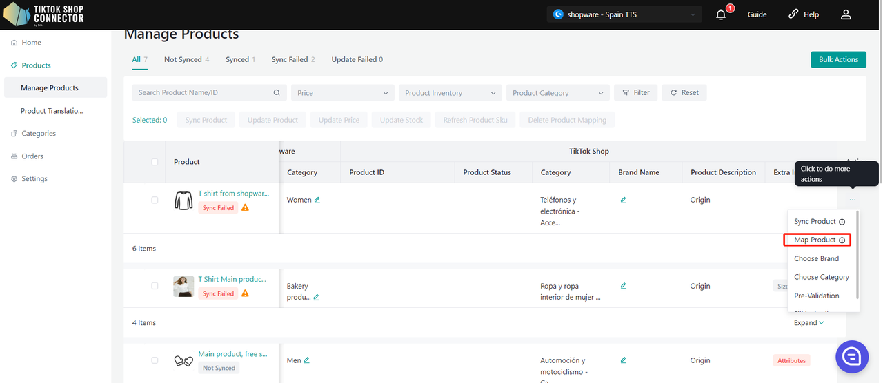 Kliknij (...) w "Actions" obok produktu, który jest w TikTok Shop -> "Map Product"
