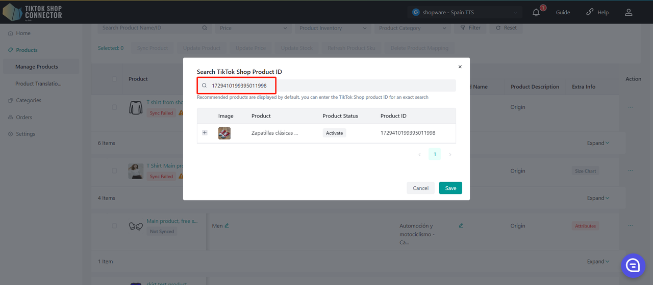 Jeśli dodasz produkt ręcznie w TikTok Shop, zmapuj istniejący produkt TikTok Shop z produktem Shopware w Connectorze. Zapewnia to zgodność produktów pomiędzy Shopware i TikTok Shop, aby zamówienia mogły się synchronizować.