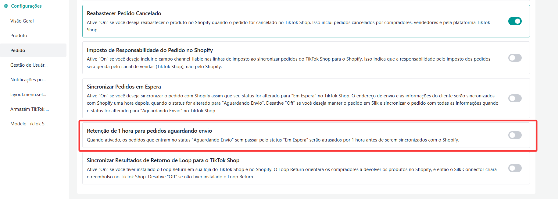 Deixe Ativado se você deseja atrasar a sincronização dos pedidos que vão diretamente de Não Pago → Aguardando Envio por 1 hora antes de enviá-los para o Shopify. Isso aplica uma janela obrigatória de cancelamento de 1 hora para o cliente.