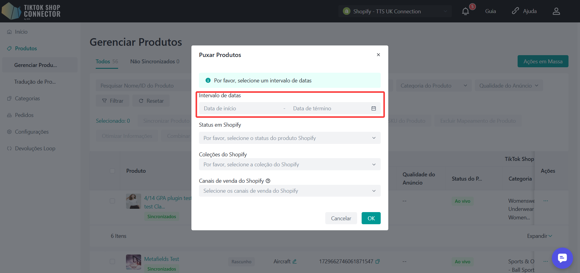 Escolha o intervalo de datas do qual deseja obter produtos do Shopify.