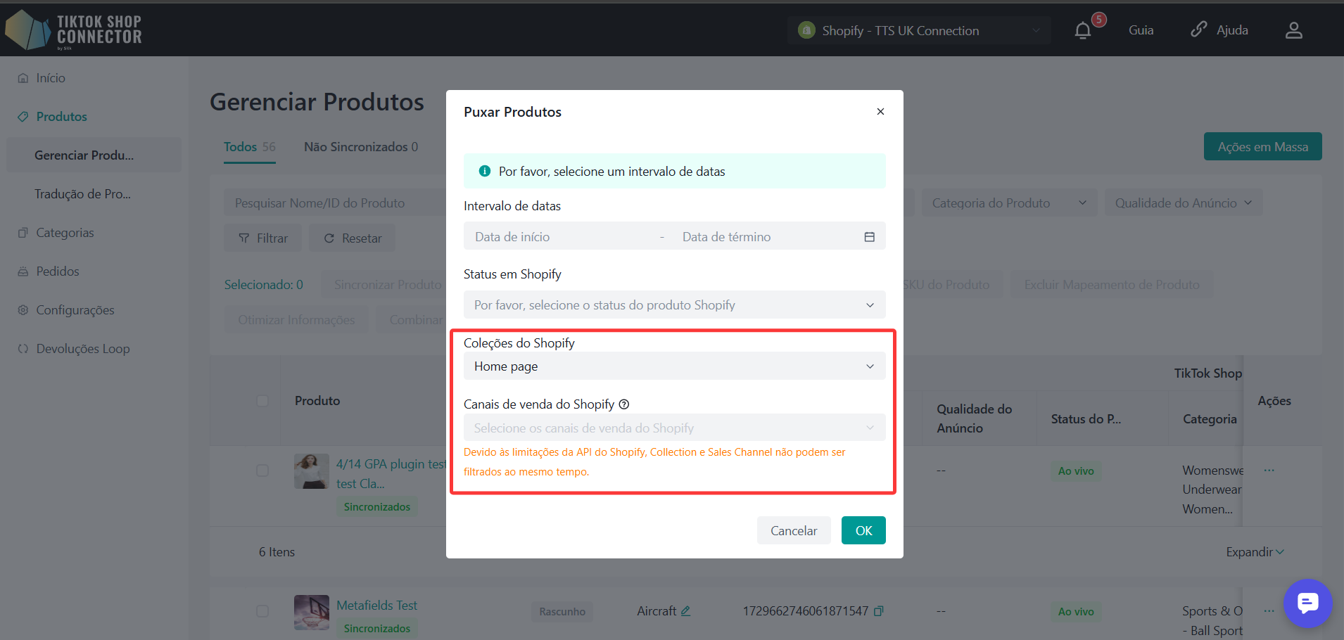 Importante: Devido às limitações da API do Shopify, coleções e canais de venda não podem ser usados juntos na mesma consulta. Se você selecionar uma coleção, o filtro de Canal de venda será desativado, e vice‑versa.