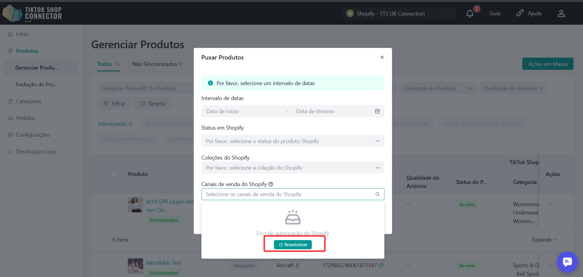 Ao usar o filtro de Canais de venda do Shopify pela primeira vez, você será solicitado a reautorizar o aplicativo do Shopify. Essa etapa é necessária para que o TikTok Shop Connector possa acessar os dados de canais de venda e disponibilidade de produtos da sua loja.