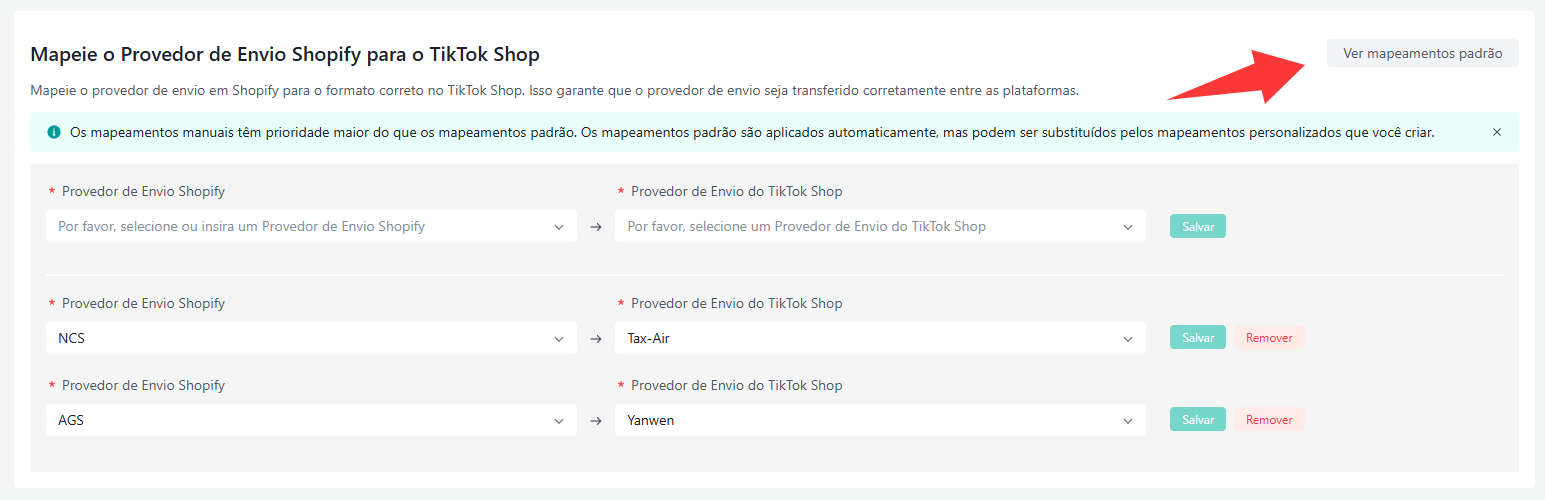 O TikTok Shop possui uma lista de provedores de envio que pode ser diferente dos do Shopify. Se os provedores de envio forem diferentes para cada uma das suas plataformas de loja, você pode mapear os provedores de envio aqui para evitar erros de sincronização.